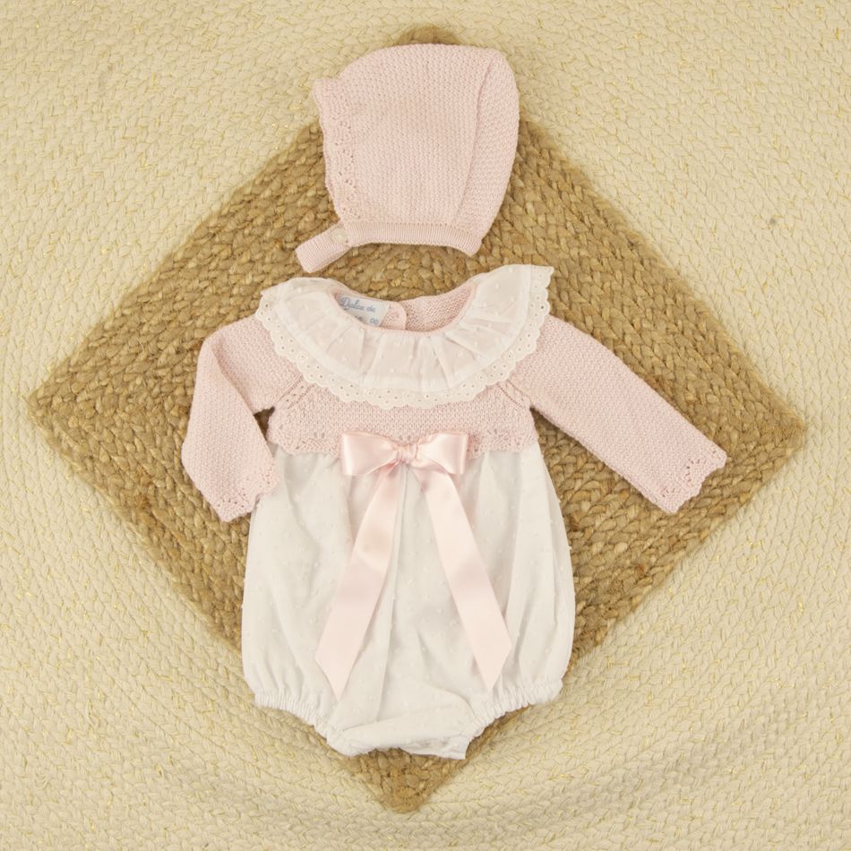 Conjunto de bebé delicado y elegante compuesto por pelele y capota a juego en tono rosa empolvado combinado con blanco. Perfecto para bautizos, celebraciones y ocasiones especiales.