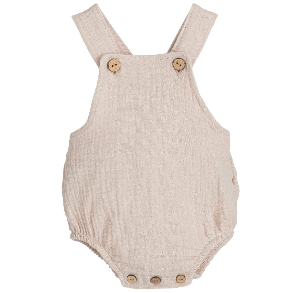 Confeccionada en tejido tipo gasa ligera y transpirable, es ideal para mantener a tu bebé cómodo durante todo el día 🌬️. Los tirantes con botones efecto madera 🌿 aportan un toque rústico y delicado, mientras que el cierre inferior con botones facilita el cambio de pañal 👶✨