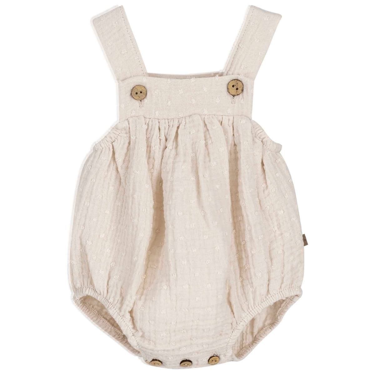 Cuando buscamos una prenda especial para los primeros meses del bebé, la suavidad del tejido y la pureza del diseño se convierten en elementos esenciales. Esta ranita bebé arena tirantes de la colección Atari de Calamaro representa a la perfección esa estética natural y delicada que tanto nos gusta en Gateos Moda Infantil.