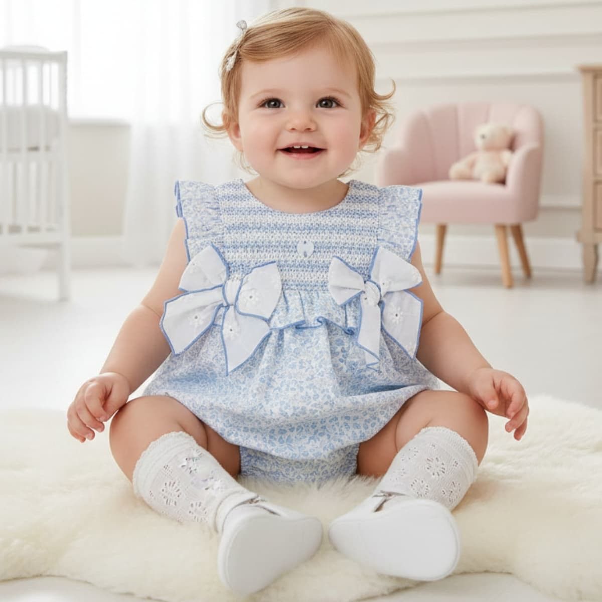 Si buscas una pieza refinada, romántica y atemporal, esta ranita bebé azul lazos bordados es una elección impecable dentro del universo Brote de Amor.