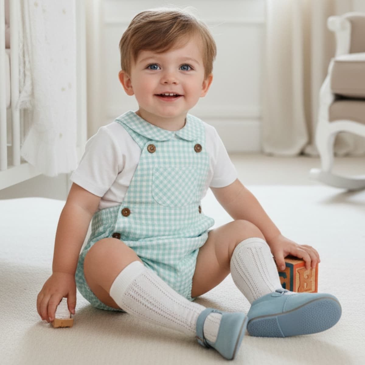 El conjunto está formado por una camisa blanca de algodón con cuello bebé en cuadro vichy verde agua y una ranita a juego con tirantes abotonados. El estampado de cuadro pequeño transmite serenidad y elegancia discreta, mientras los botones de madera aportan un detalle cálido y artesanal que equilibra el conjunto.