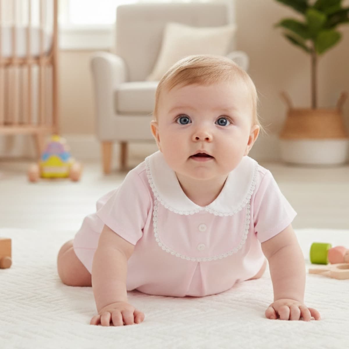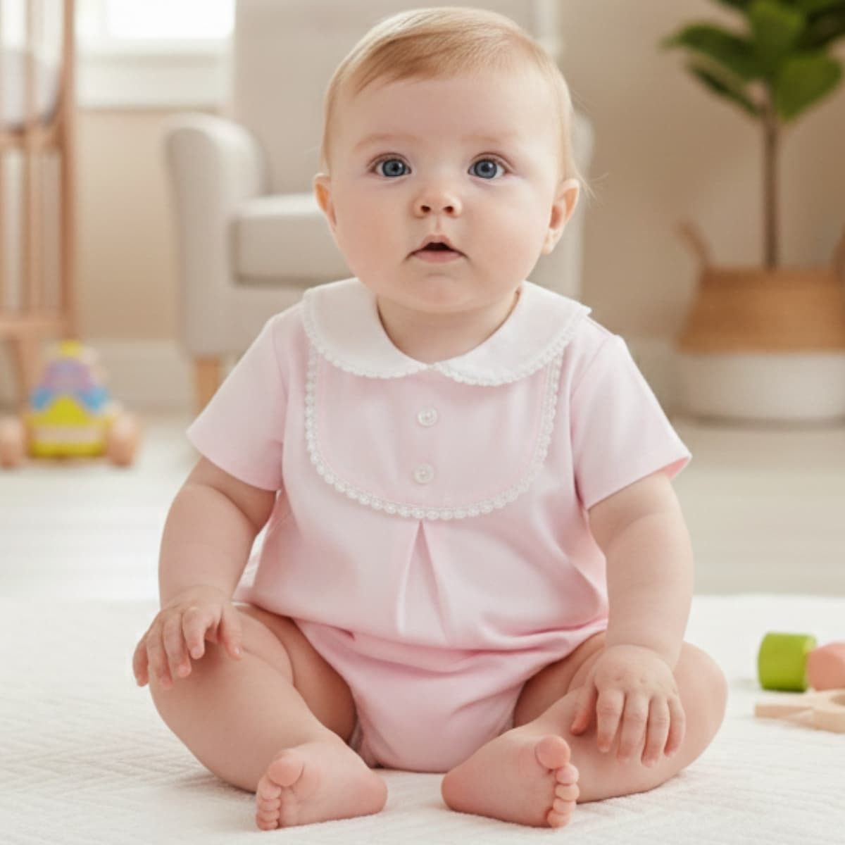 El tono rosa empolvado —dulce, luminoso y atemporal— realza la piel del bebé sin estridencias, convirtiéndola en una elección refinada para primavera y verano.