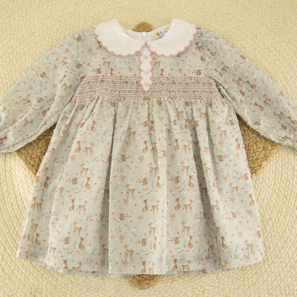 Dulce y elegante vestido para bebé niña en tono verde agua, con un encantador estampado de pequeños cervatillos y flores.