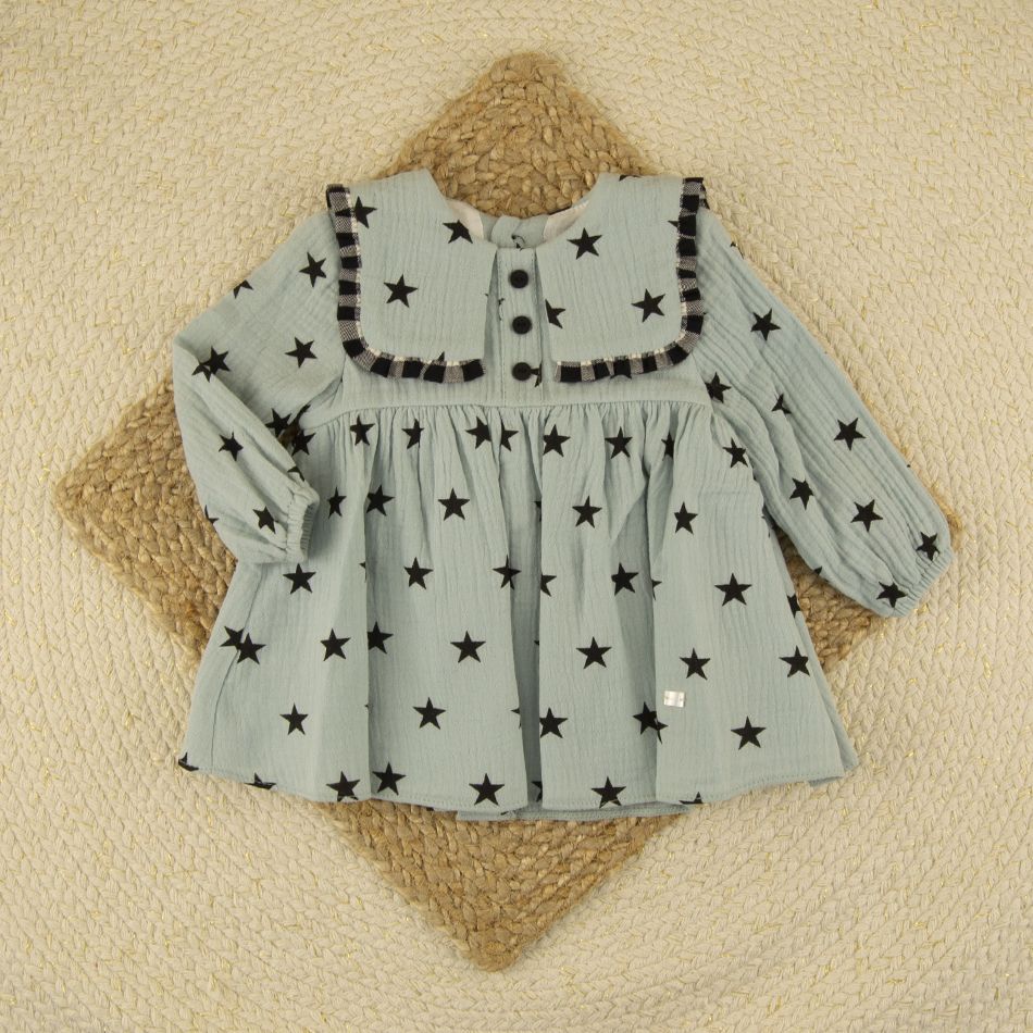 Presenta un encantador estampado de estrellas negras sobre fondo verde empolvado, aportando un estilo moderno y muy dulce.
