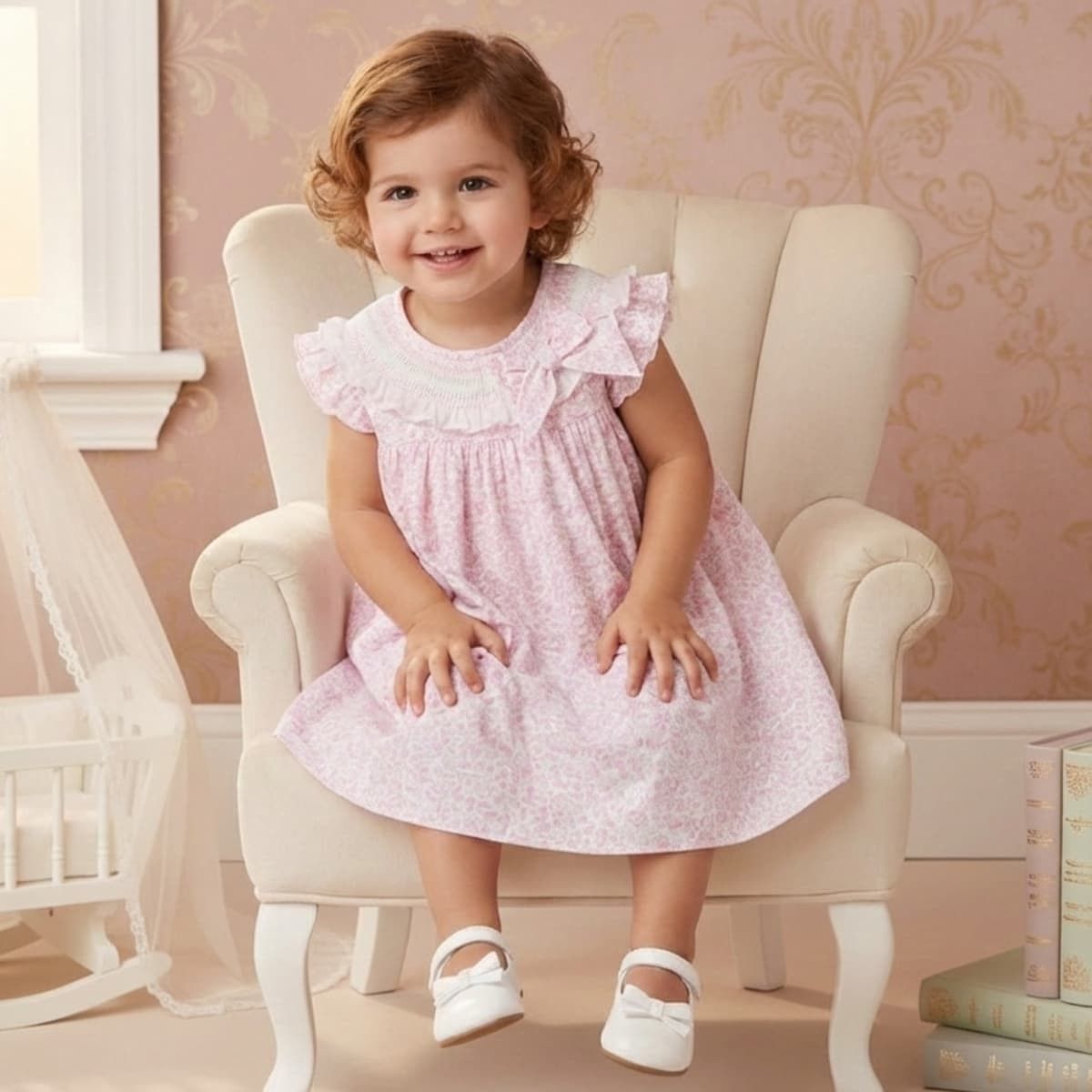 Confeccionado en 100% algodón, su tejido es ligero, transpirable y especialmente suave con la piel sensible del bebé. El estampado floral en rosa empolvado sobre fondo blanco transmite dulzura serena y una estética clásica renovada.