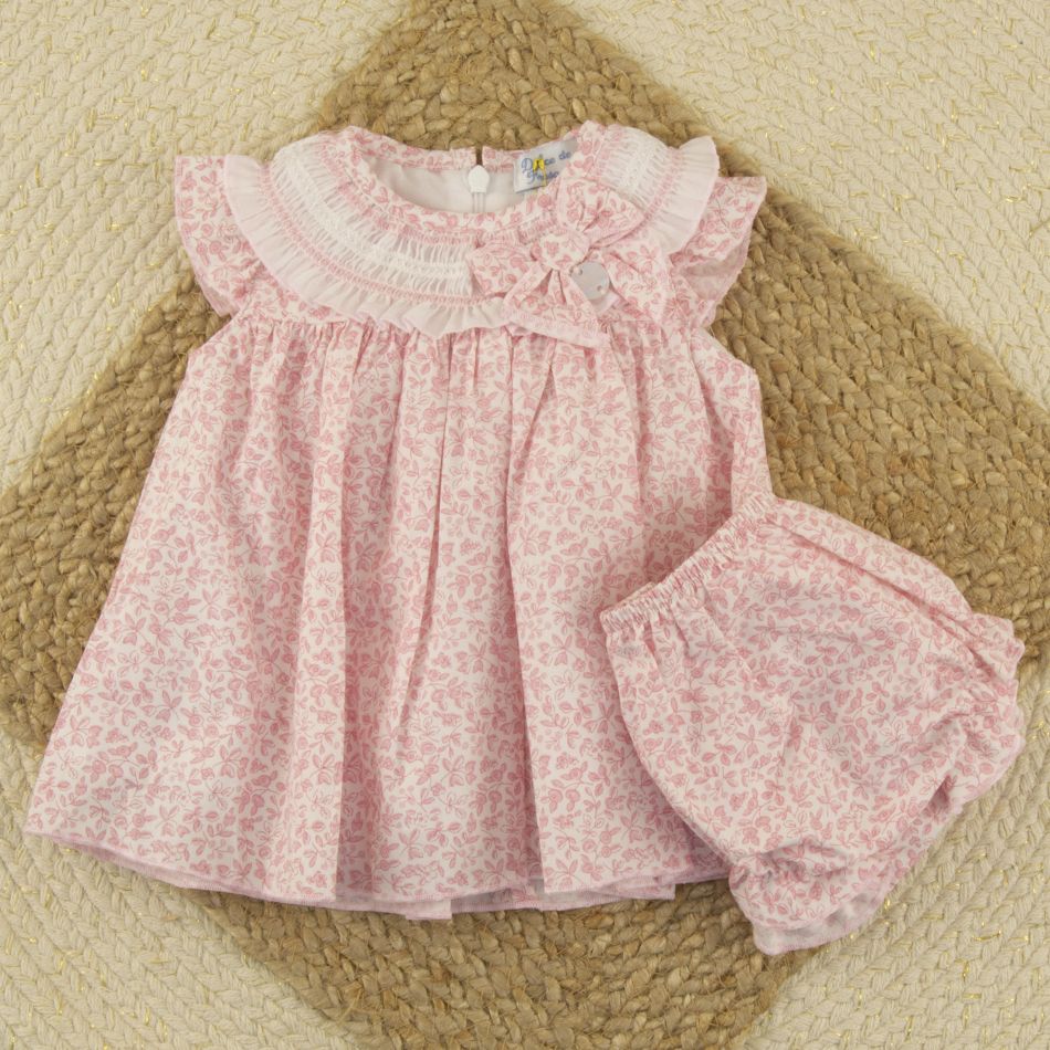 Este vestido bebé rosa cuello bordado completa la línea rosa ofreciendo una alternativa más clásica frente a la versión con lazo protagonista.