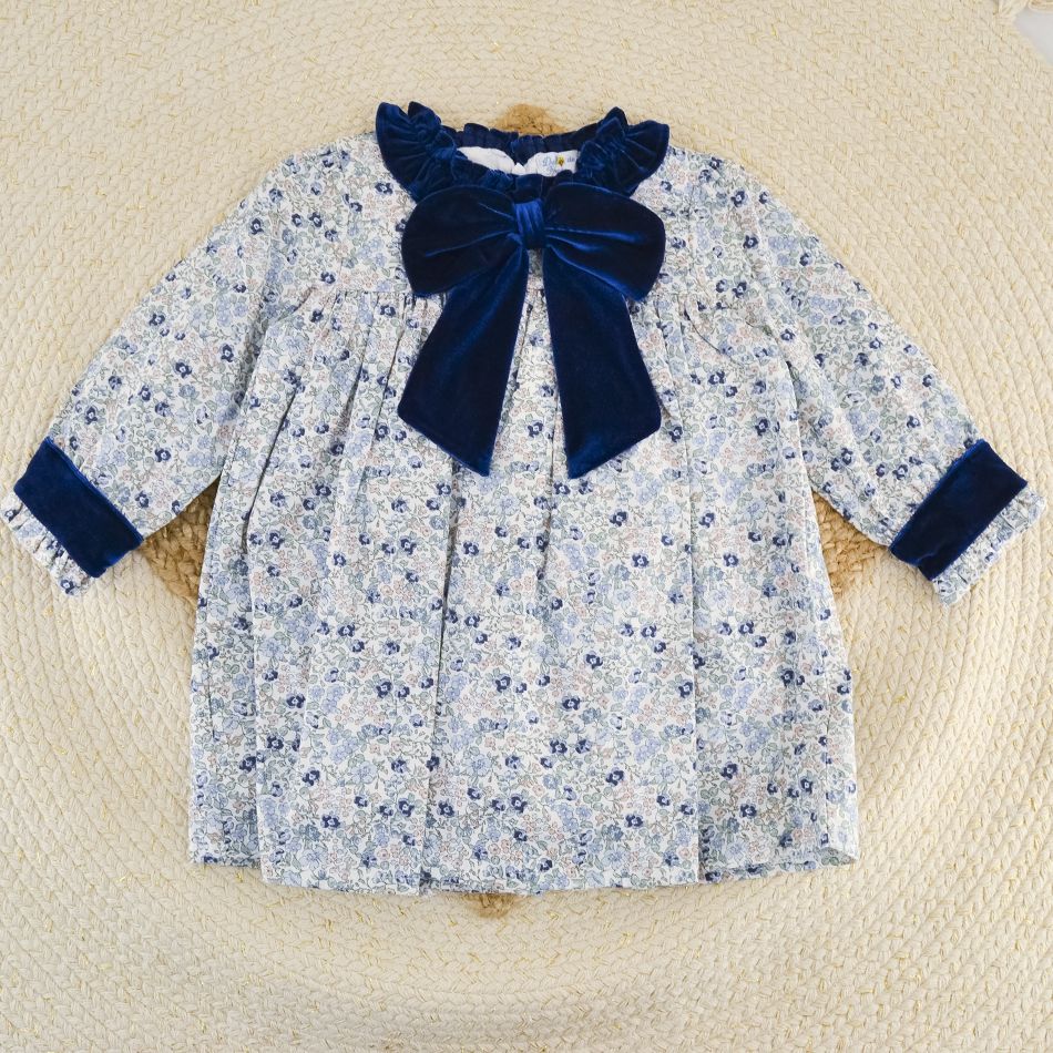 Cuello volante y lazo grande aterciopelado y tela estampada de la colección.