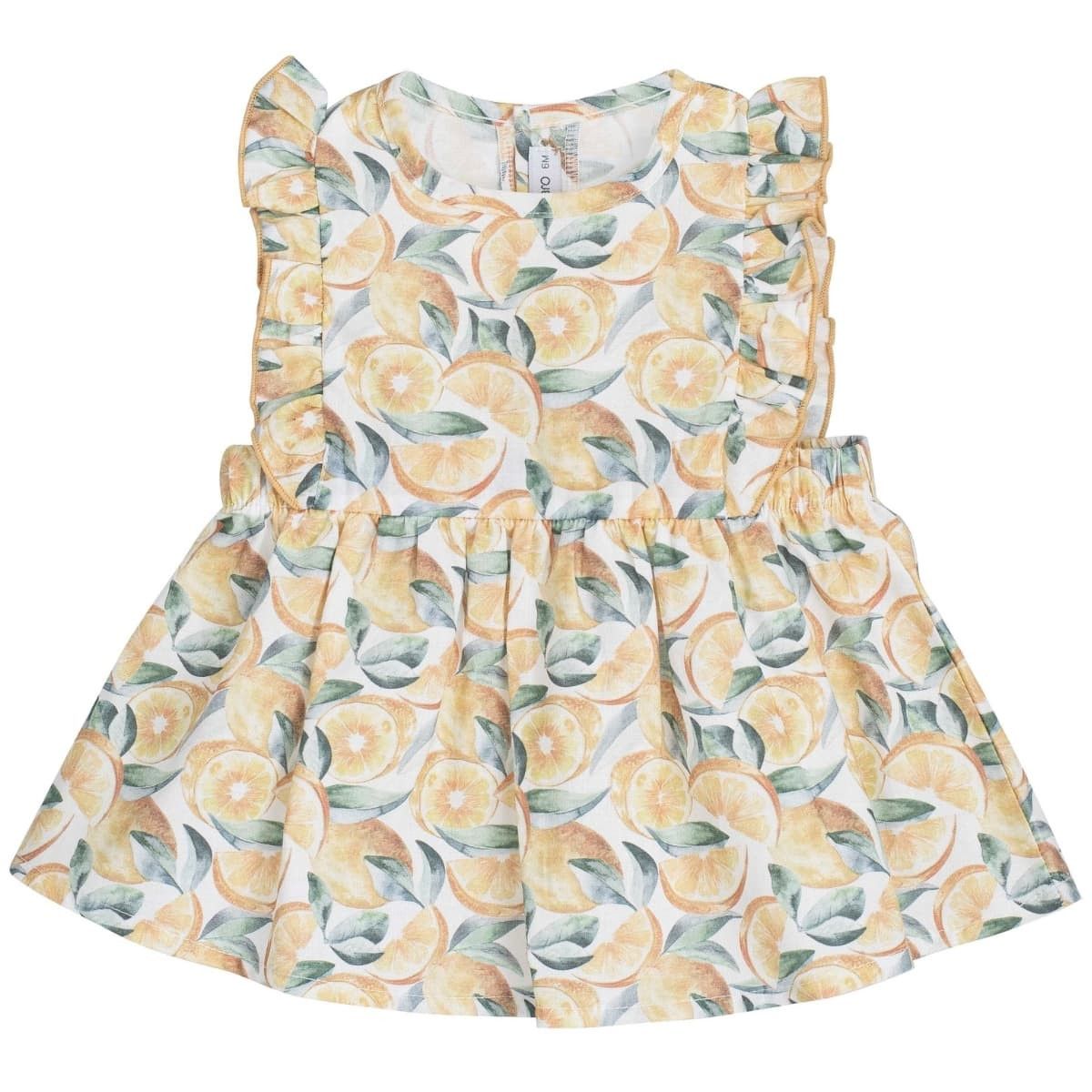 Alegre y fresco vestido para bebé con precioso estampado de limones y hojas en tonos amarillos y verdes sobre fondo claro. Un diseño veraniego, dulce y lleno de luz, perfecto para los días más soleados.