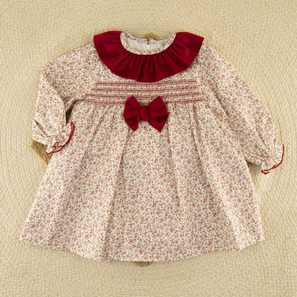 Encantador vestido para bebé niña confeccionado en un suave tejido estampado floral en tonos granate y beige, ideal para los días de otoño e invierno.