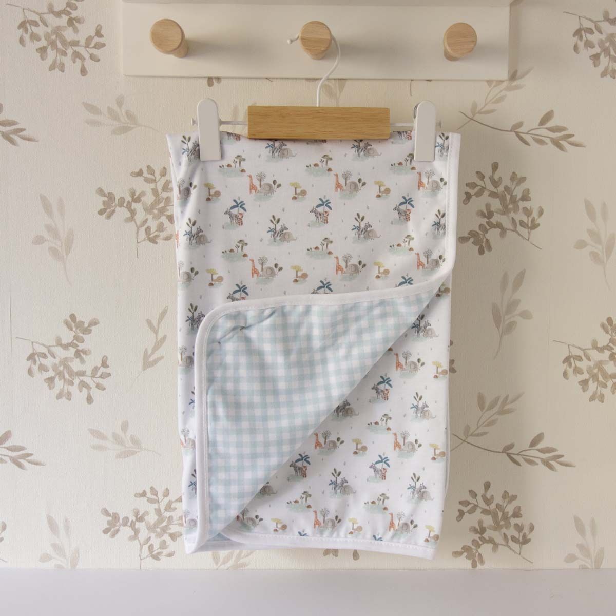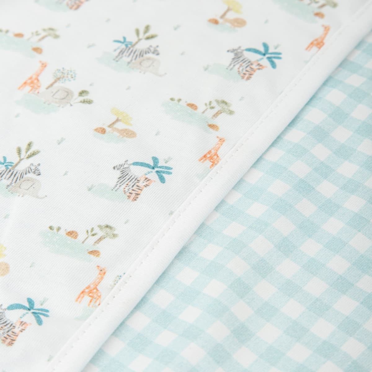 Arrullo bebé reversible en tono verde agua confeccionado en 100% algodón, con un lado estampado delicado y otro en vichy suave. Ligero, transpirable y muy agradable al tacto, es ideal para envolver al bebé con comodidad desde el nacimiento. Perfecto para hospital, paseo o descanso.