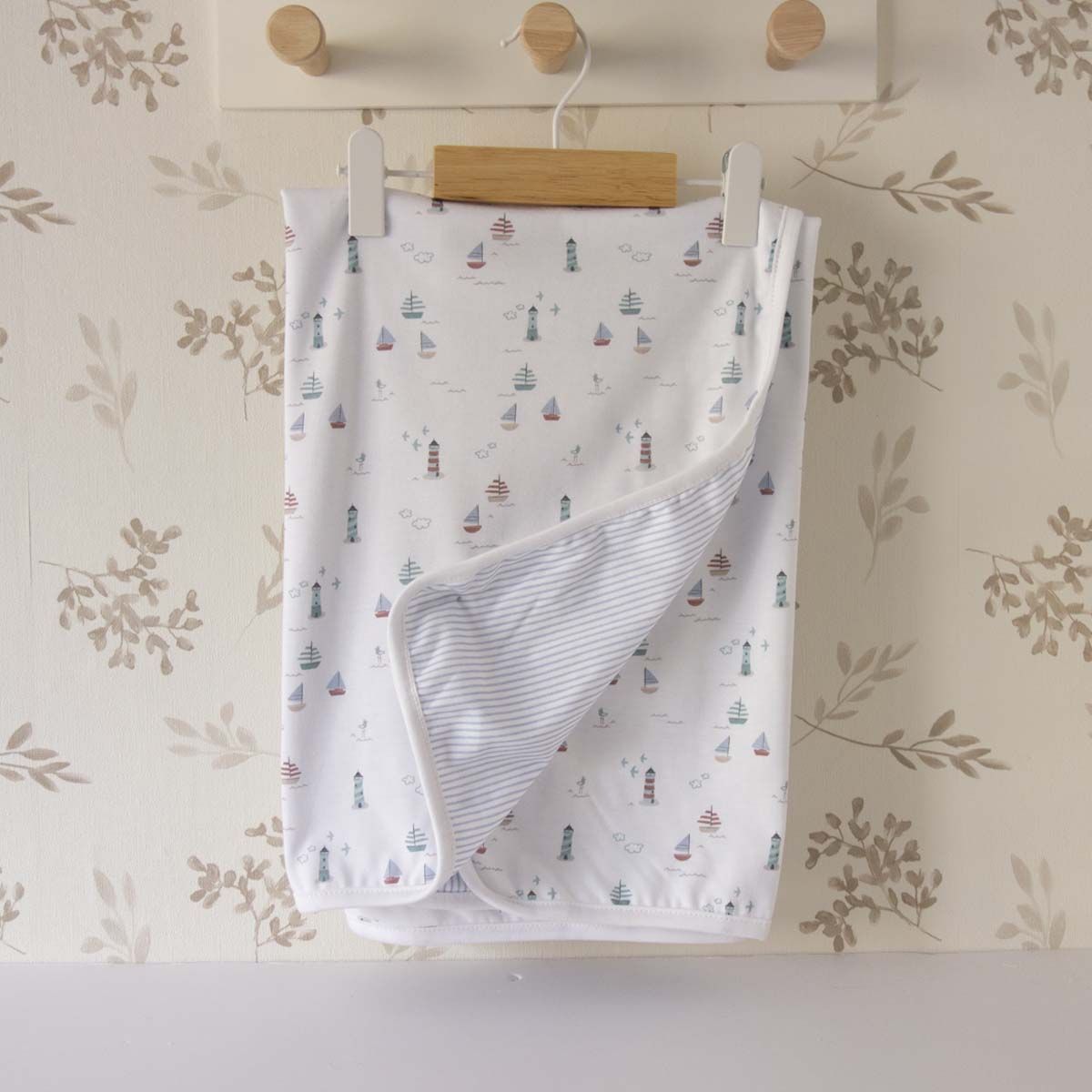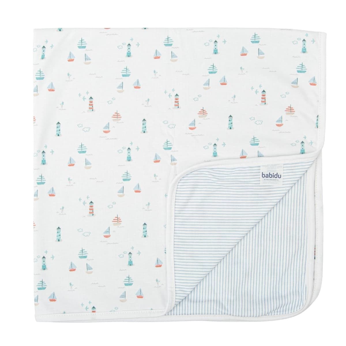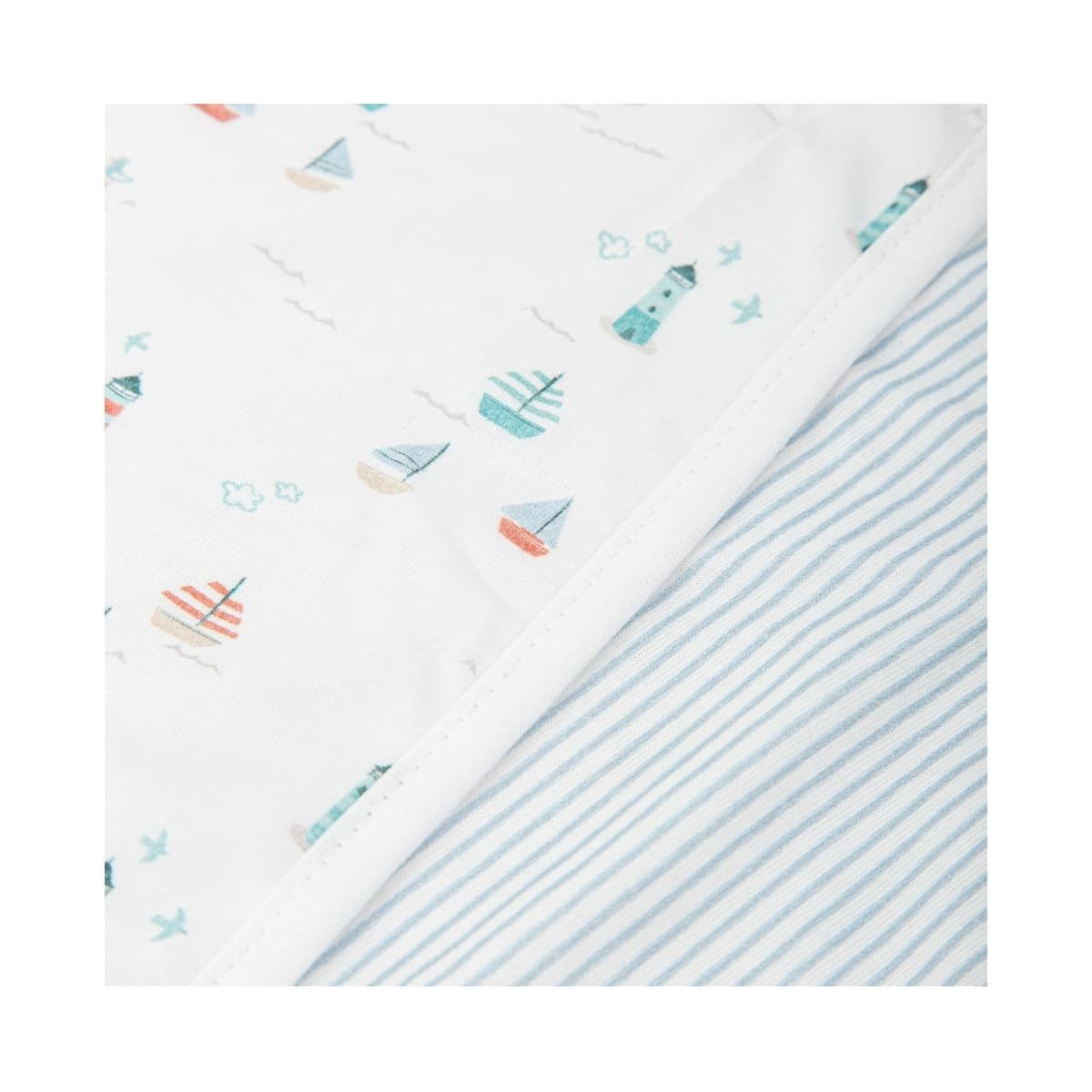 Este arrullo de Babidu combina diseño y practicidad. Presenta un estampado de pequeños barcos en tonos suaves sobre fondo claro, acompañado de un reverso de rayas finas en verde agua. Su confección de doble capa ligera y su caída flexible permiten envolver al bebé con facilidad, adaptándose a su cuerpo sin generar rigidez.