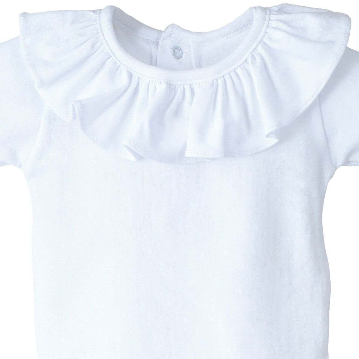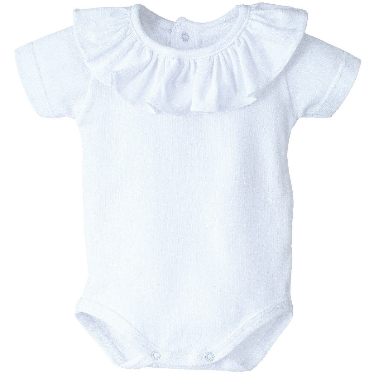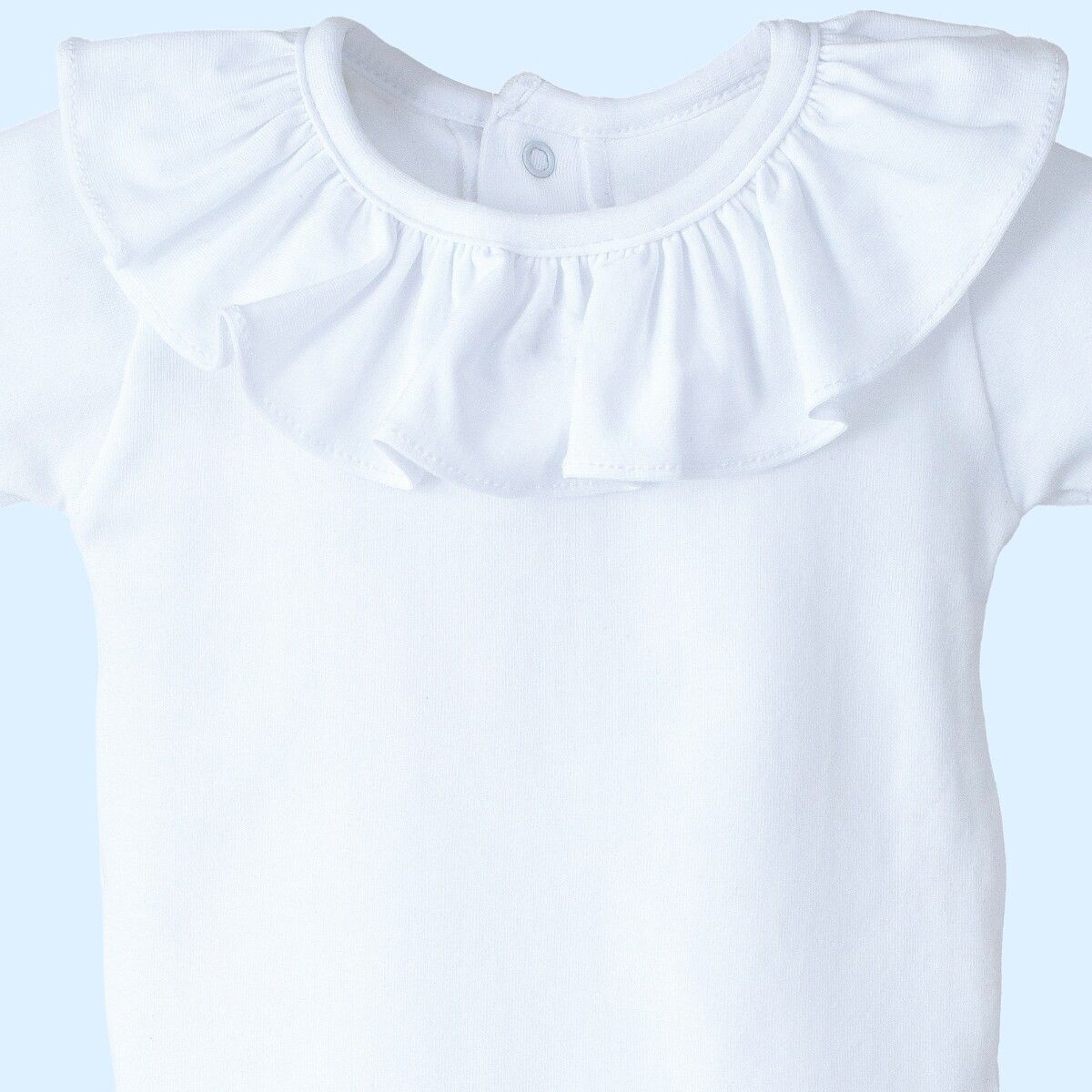 El body bebé elegante blanco cuello volante Calamaro Titán Elas es una prenda diseñada para aportar luz, elegancia y comodidad en los meses de verano. Su diseño en blanco puro con cuello volante amplio crea un look limpio, sofisticado y muy delicado, ideal para madres que buscan un estilo cuidado y atemporal.