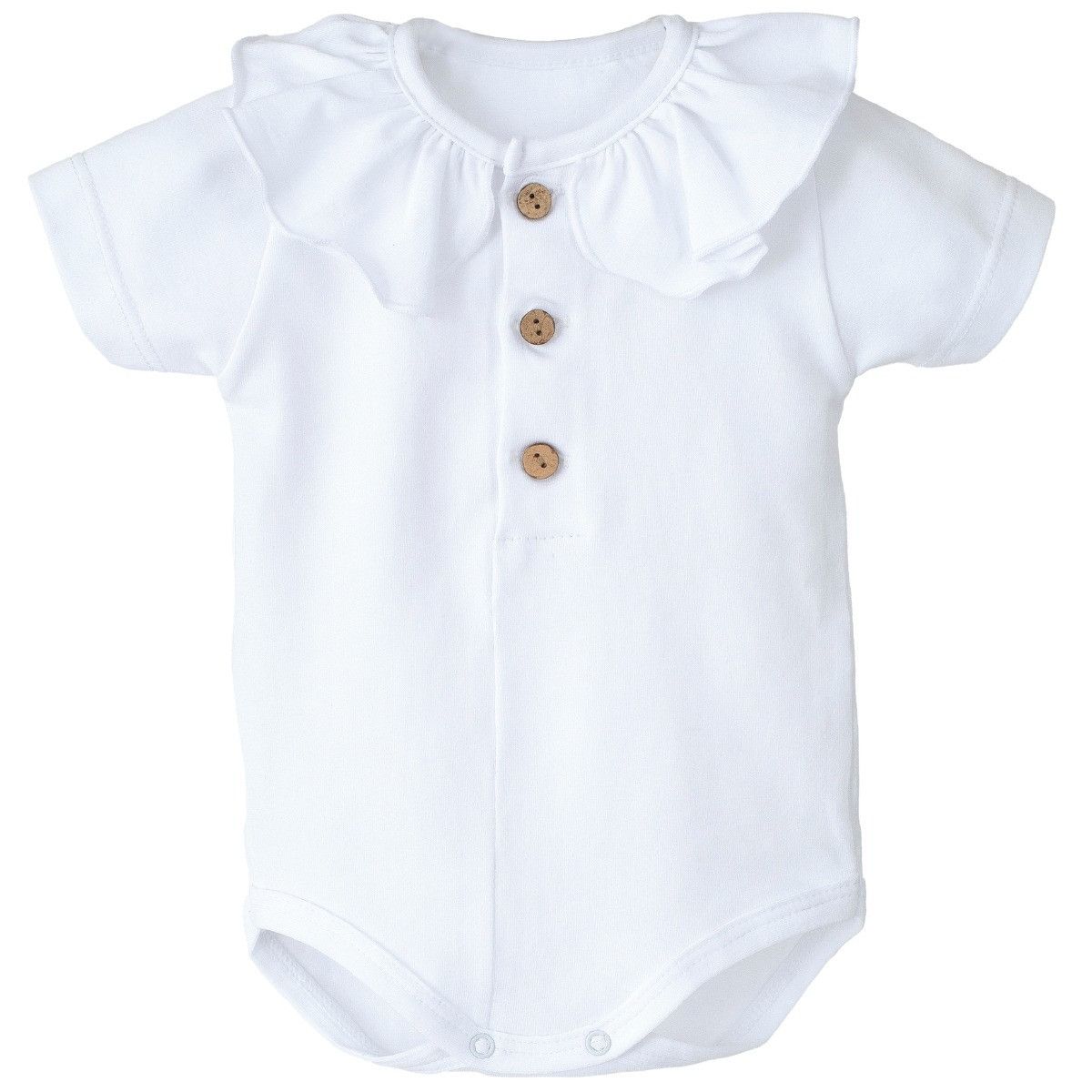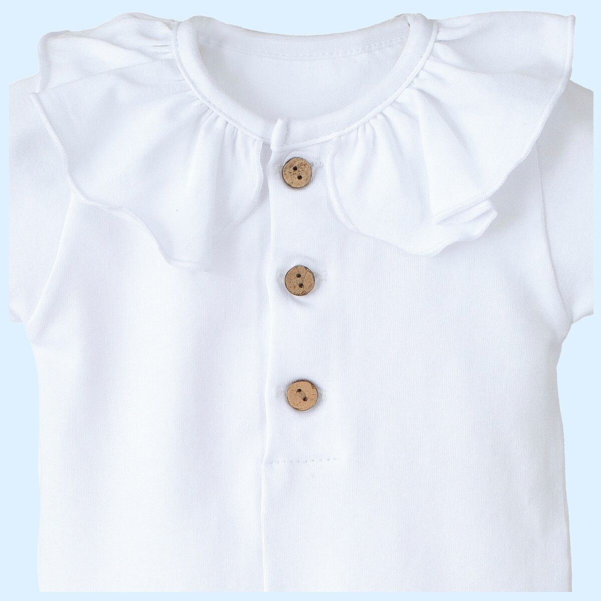 Este body bebé blanco combina perfectamente con pololos en tonos neutros, bermudas en lino o conjuntos en colores suaves como beige, arena o azul. También es ideal para looks más formales, creando estilismos elegantes y equilibrados.