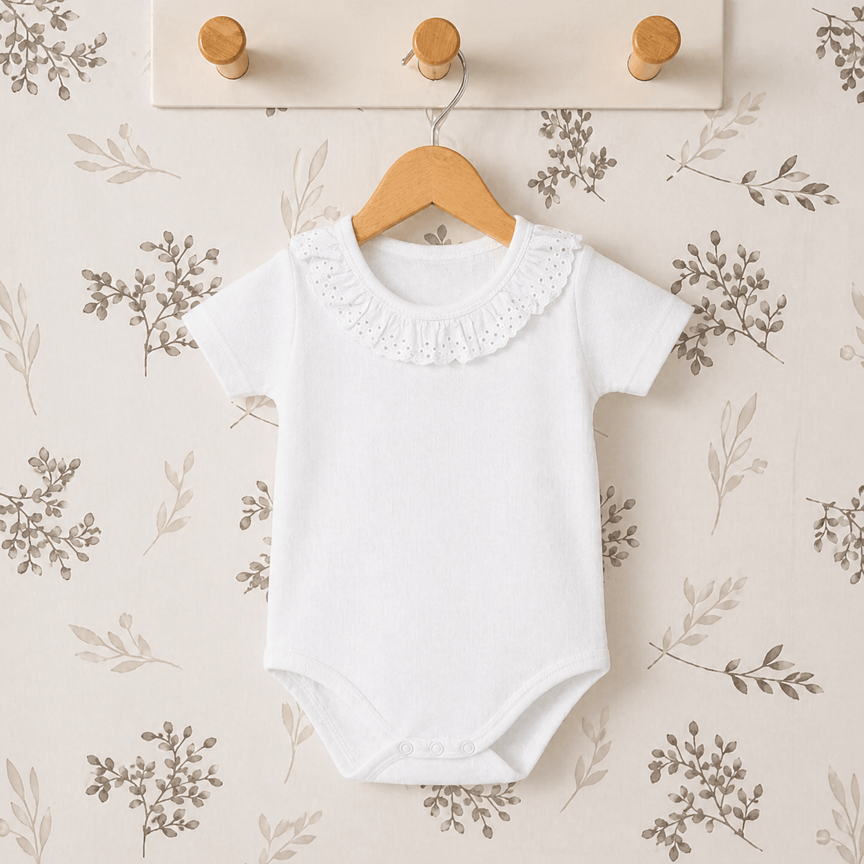 Este body bebé blanco combina perfectamente con pololos en tonos neutros, ranitas en lino o conjuntos en colores suaves como beige, arena o azul. También es ideal para estilismos más arreglados, creando looks elegantes y equilibrados.