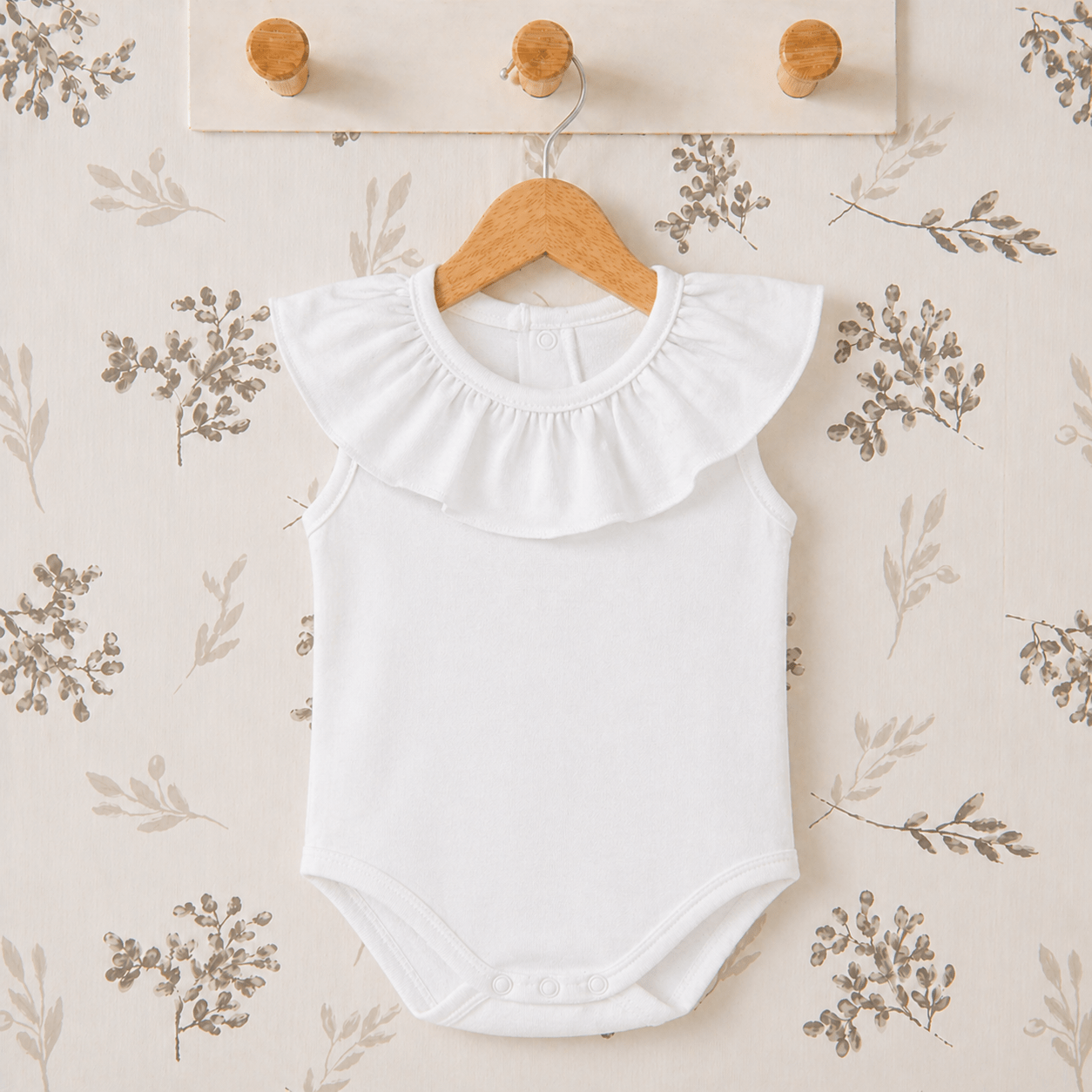 Dentro de la categoría de bodies de bebé con volante para verano, este modelo destaca por su ligereza. Los bodies sin mangas son perfectos para mantener al bebé fresco, y este diseño añade un toque especial gracias a su cuello con volumen.