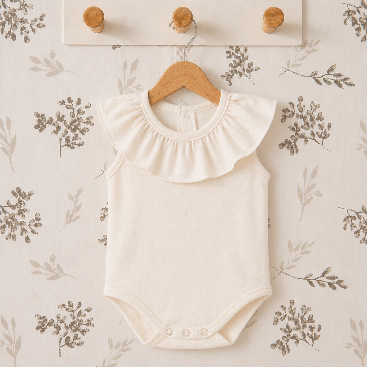 Este body bebé crudo combina perfectamente con pololos en tonos arena, ranitas en lino o conjuntos en colores neutros como beige o blanco roto. También es ideal para estilismos naturales y elegantes.