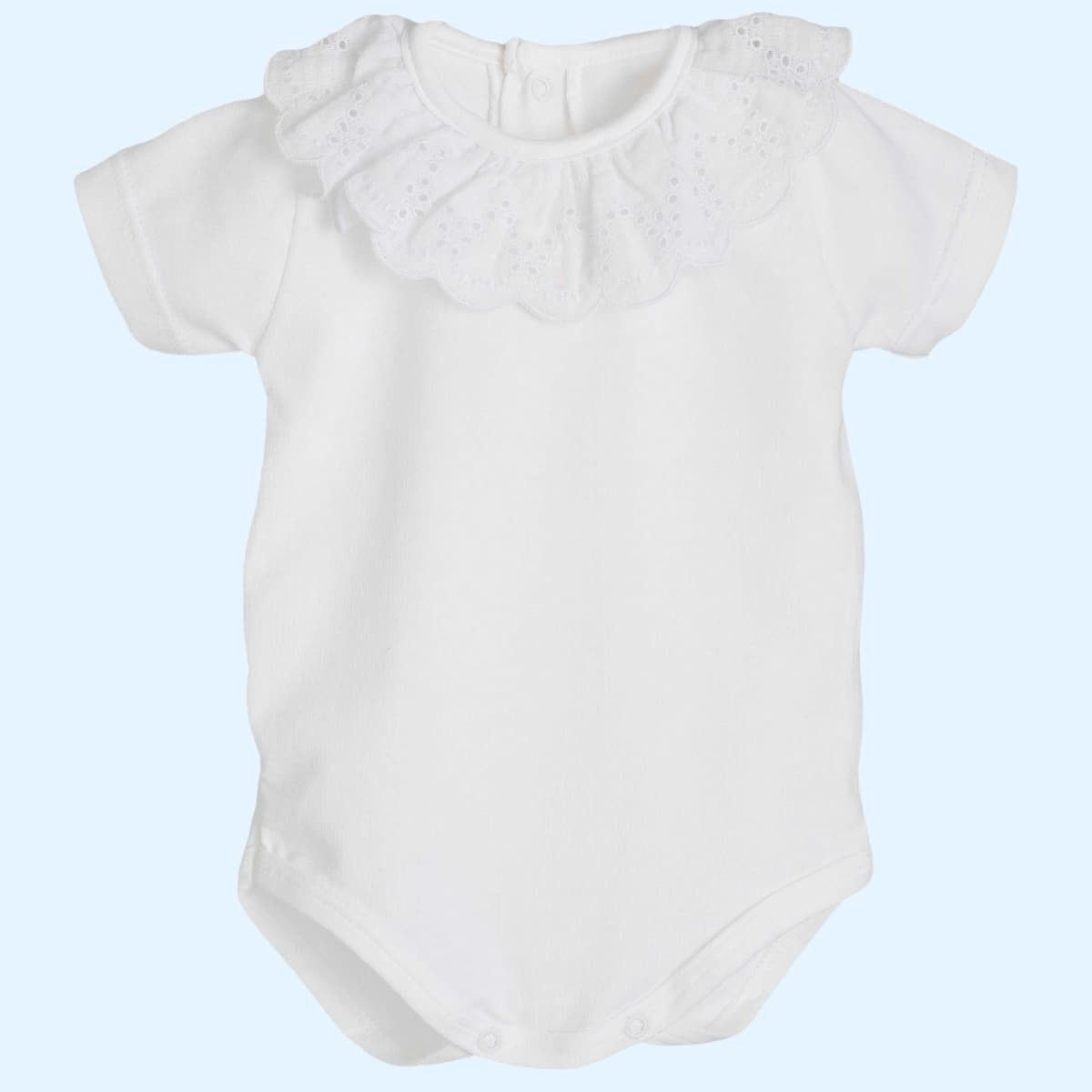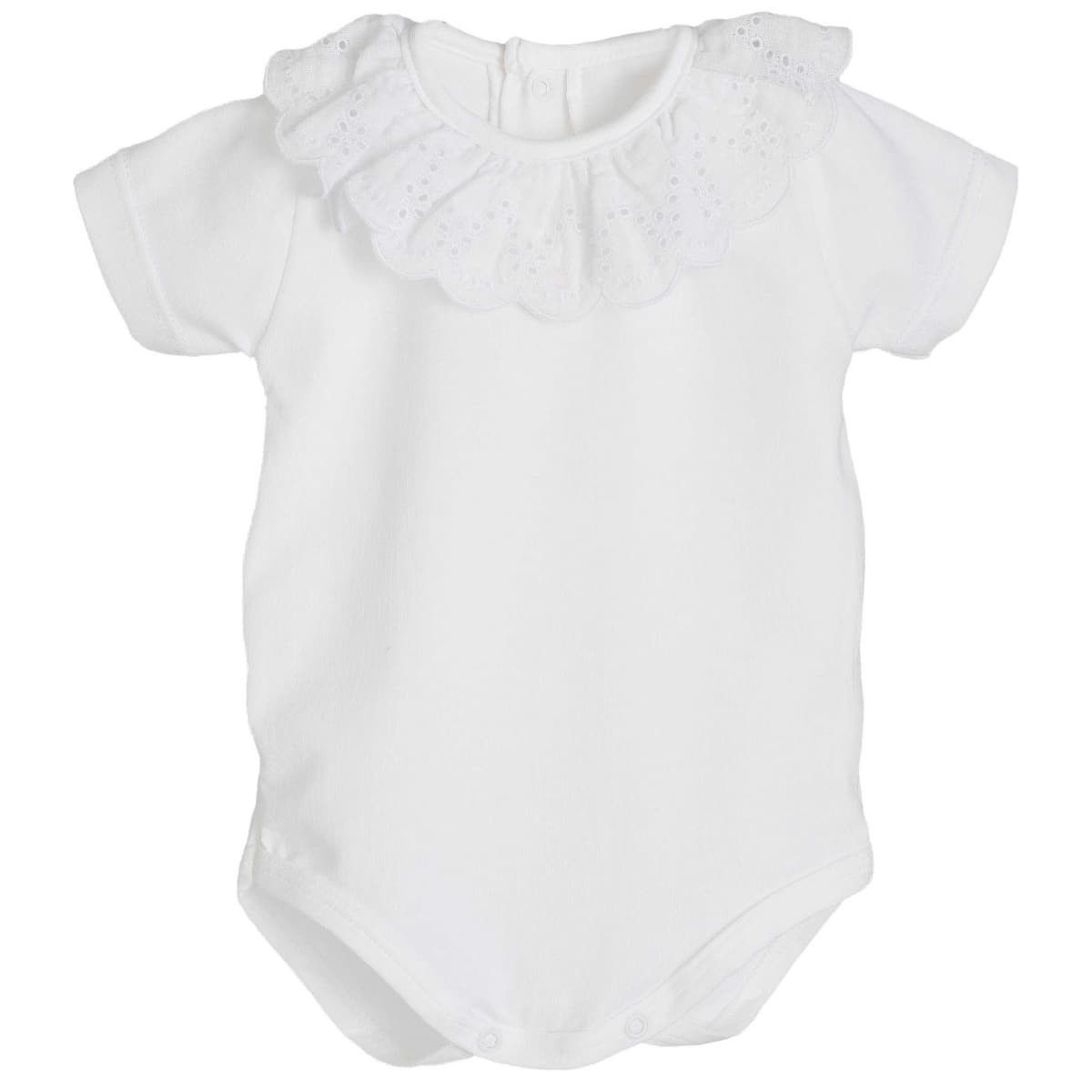 Este body bebé blanco combina perfectamente con pololos en tonos neutros, ranitas en lino o conjuntos en colores suaves como beige, arena o rosa empolvado. También es ideal para looks más arreglados, creando estilismos elegantes y armoniosos.