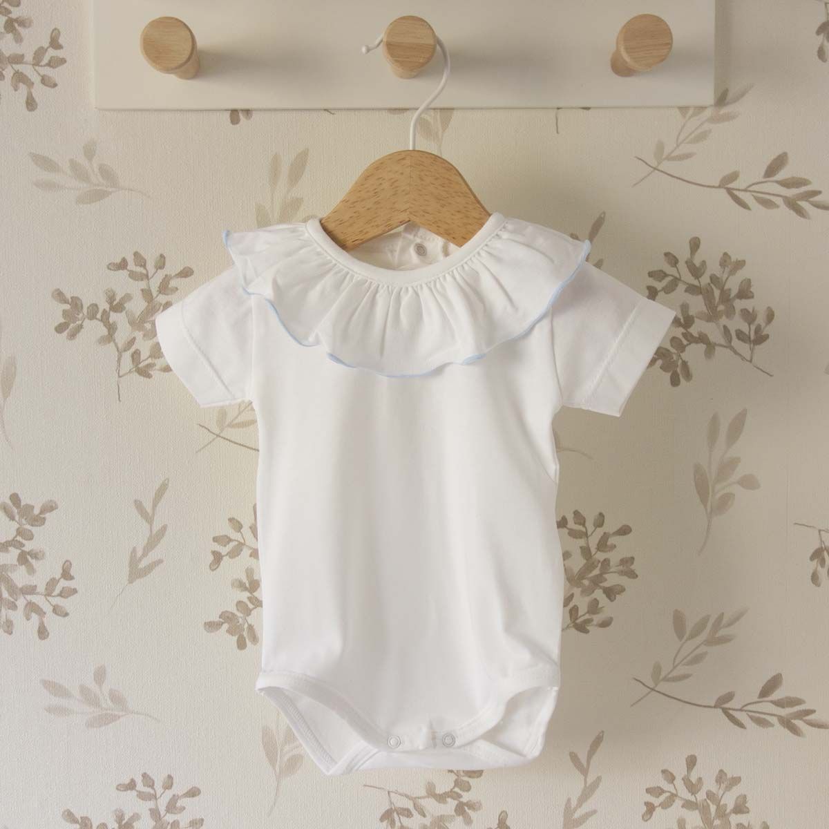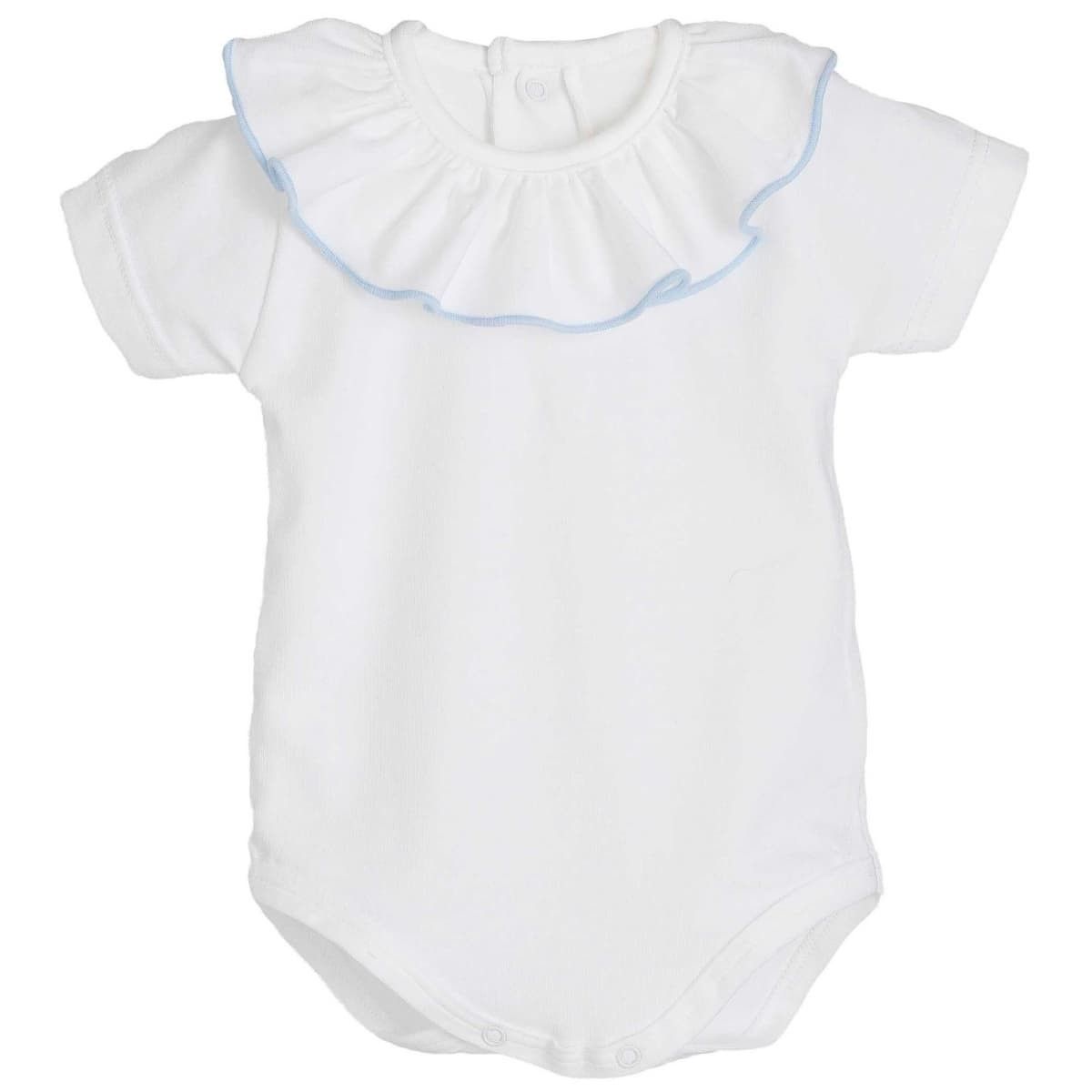 Este body bebé celeste combina perfectamente con pololos en tonos crudo, conjuntos en lino o ranitas en colores suaves como beige, arena o blanco roto. También es ideal para looks veraniegos con tonos pastel, creando estilismos equilibrados y frescos.