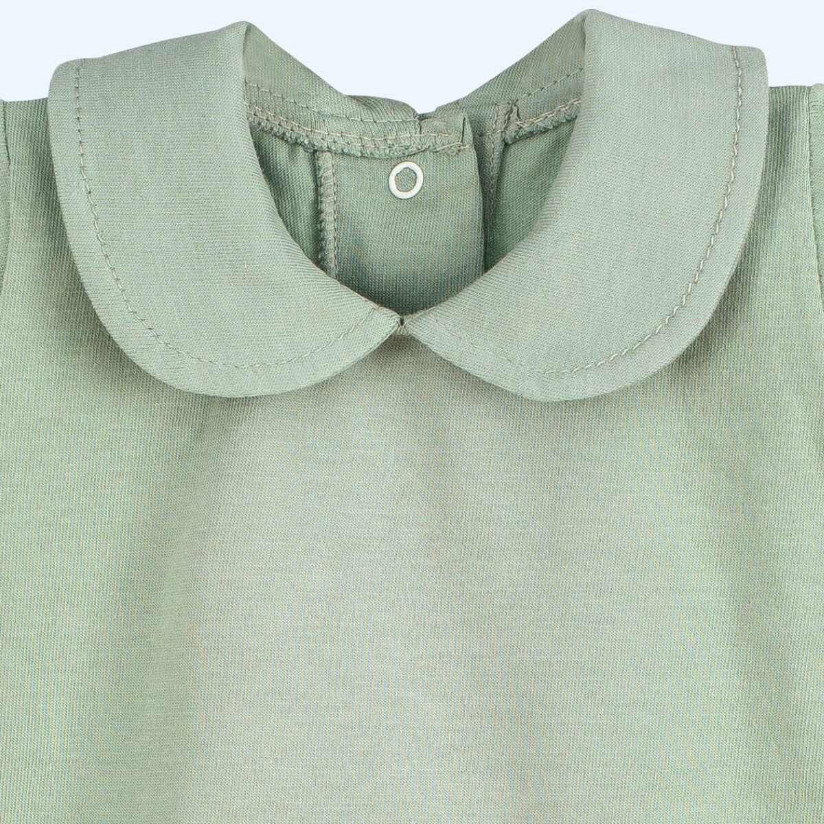 El tejido de algodón elástico proporciona una textura suave, flexible y muy agradable al tacto. El color mint aporta una sensación visual fresca, mientras que el cuello bebé redondo añade un acabado clásico que equilibra el conjunto.