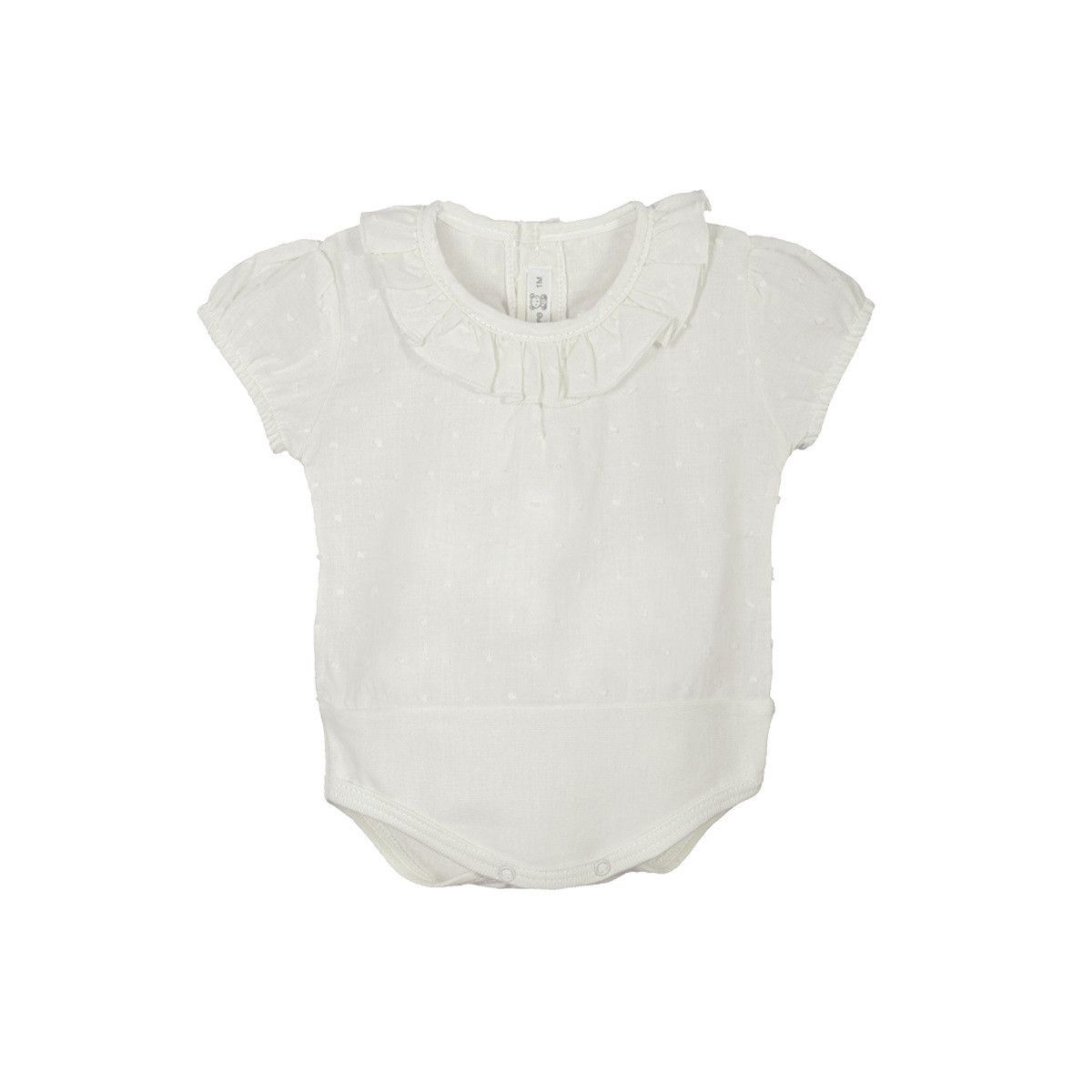 Este body bebé blanco combina perfectamente con pololos en tonos neutros, ranitas en lino o conjuntos en colores suaves como beige, arena o rosa empolvado. También es ideal para estilismos más arreglados, creando looks elegantes y equilibrados para ocasiones especiales.