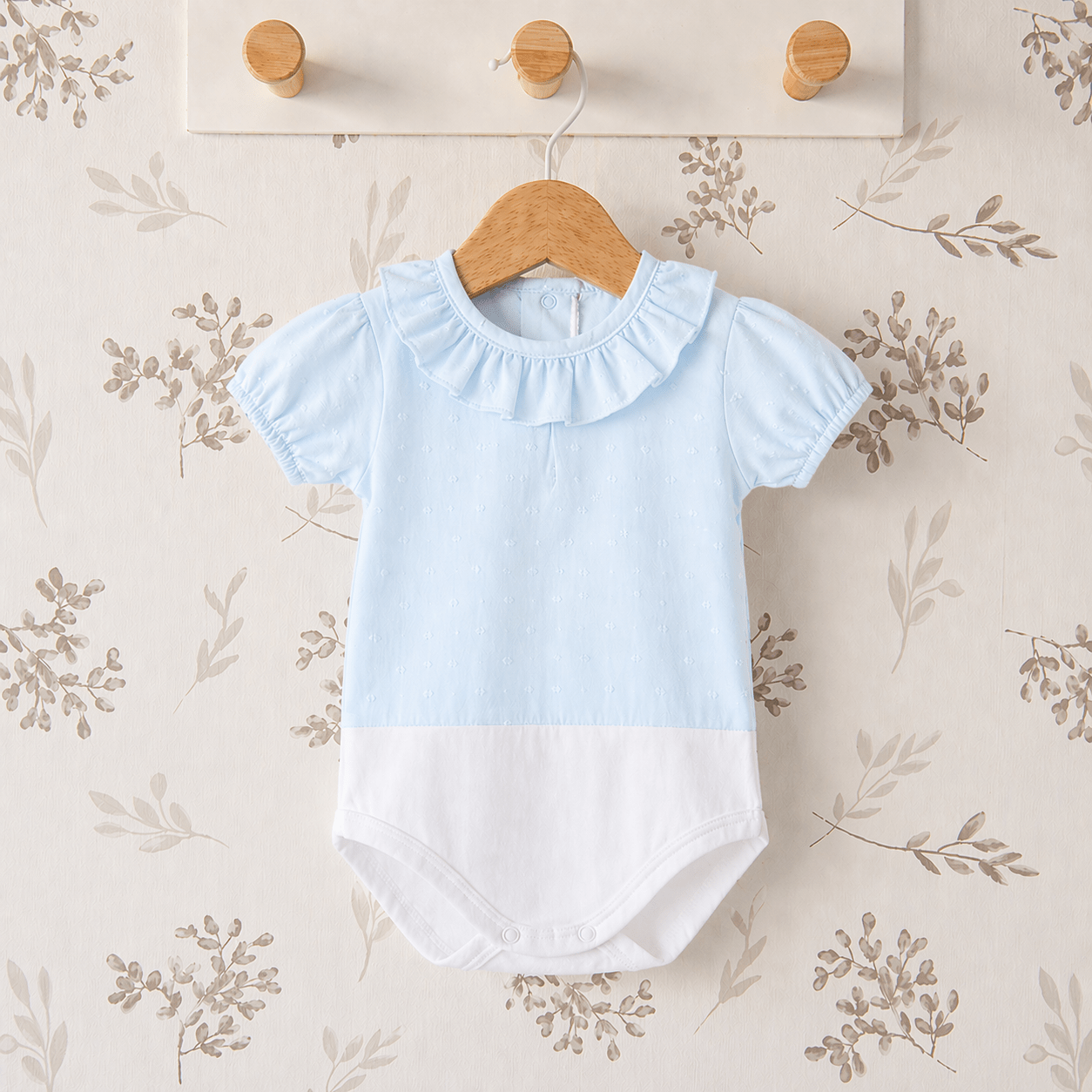 Este body bebé celeste combina perfectamente con pololos en tonos blancos, ranitas en lino o conjuntos en colores suaves como gris claro, beige o arena. También es ideal para estilismos en tonos pastel, creando looks elegantes y armoniosos.