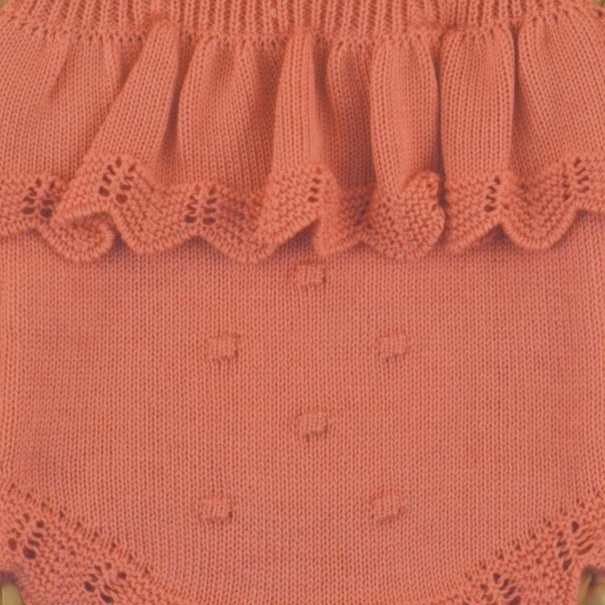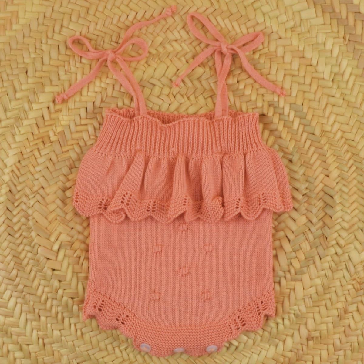 Este body está confeccionado en punto fino en tono coral, un color luminoso que aporta frescura y alegría al conjunto. Su diseño incorpora tirantes ajustables que se anudan con lazos, un detalle delicado que añade personalidad y permite adaptar la prenda con comodidad.
