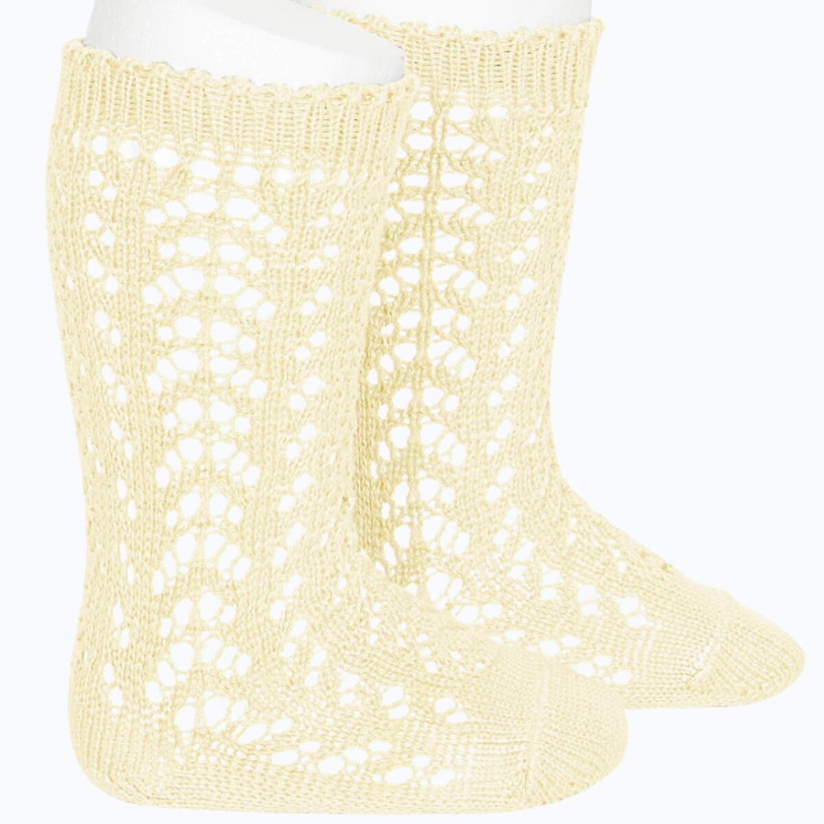 Confeccionados en suave algodón con un bonito dibujo calado, estos calcetines garantizan transpirabilidad, comodidad y un ajuste perfecto durante todo el día. El remate ondulado en el puño añade un detalle encantador que los hace aún más especiales.