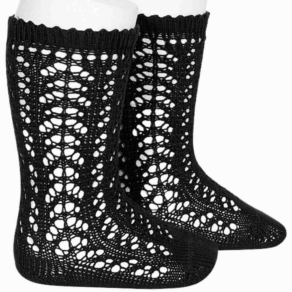 Delicados calcetines calados negro ideales para completar los conjuntos más elegantes de tu peque. Su diseño clásico y refinado combina a la perfección con vestidos, ranitas y conjuntos de ceremonia, aportando un toque dulce y tradicional.
