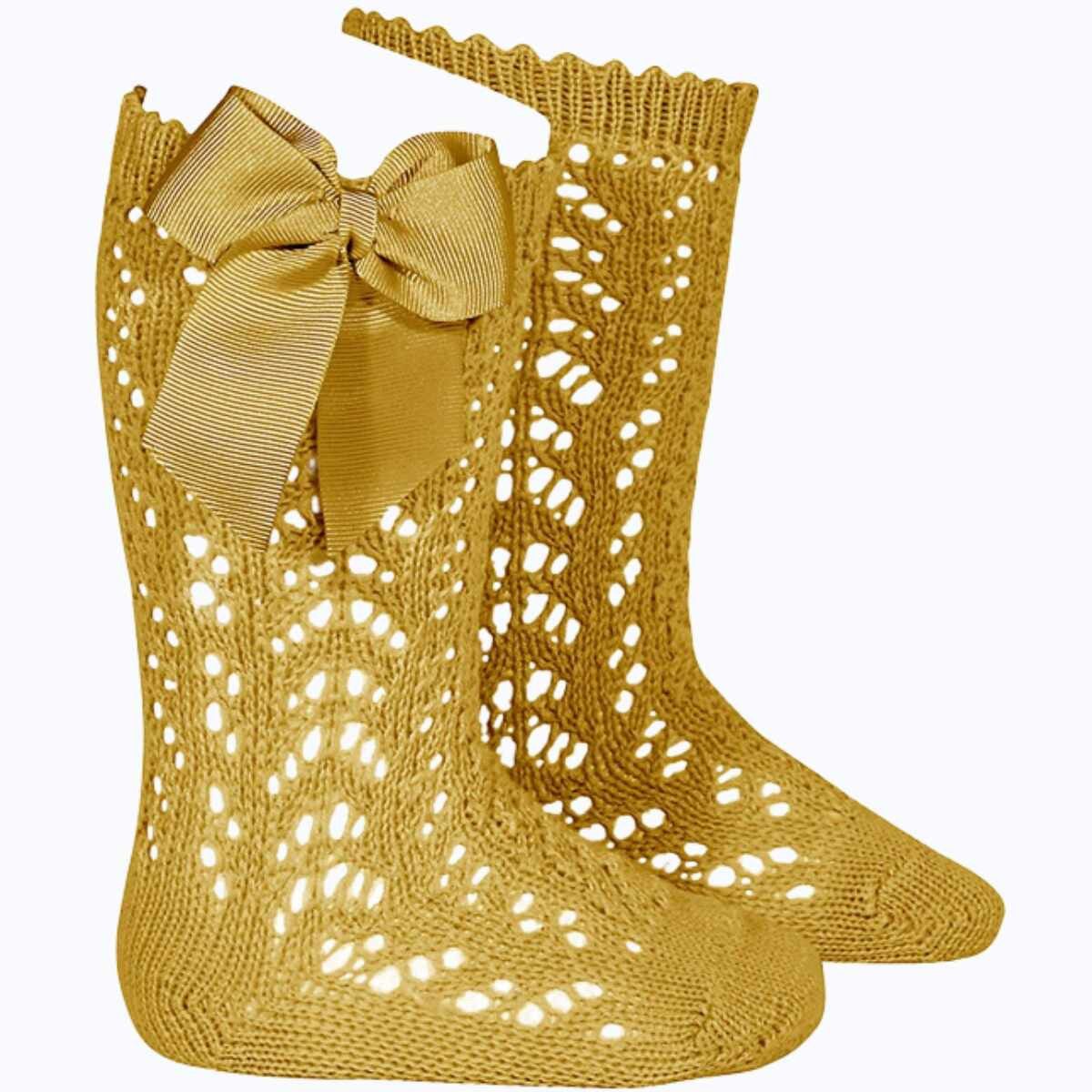 Delicados calcetines calados mostaza con lazos ideales para completar los conjuntos más elegantes de tu peque. Su diseño clásico y refinado combina a la perfección con vestidos, ranitas y conjuntos de ceremonia, aportando un toque dulce y tradicional.