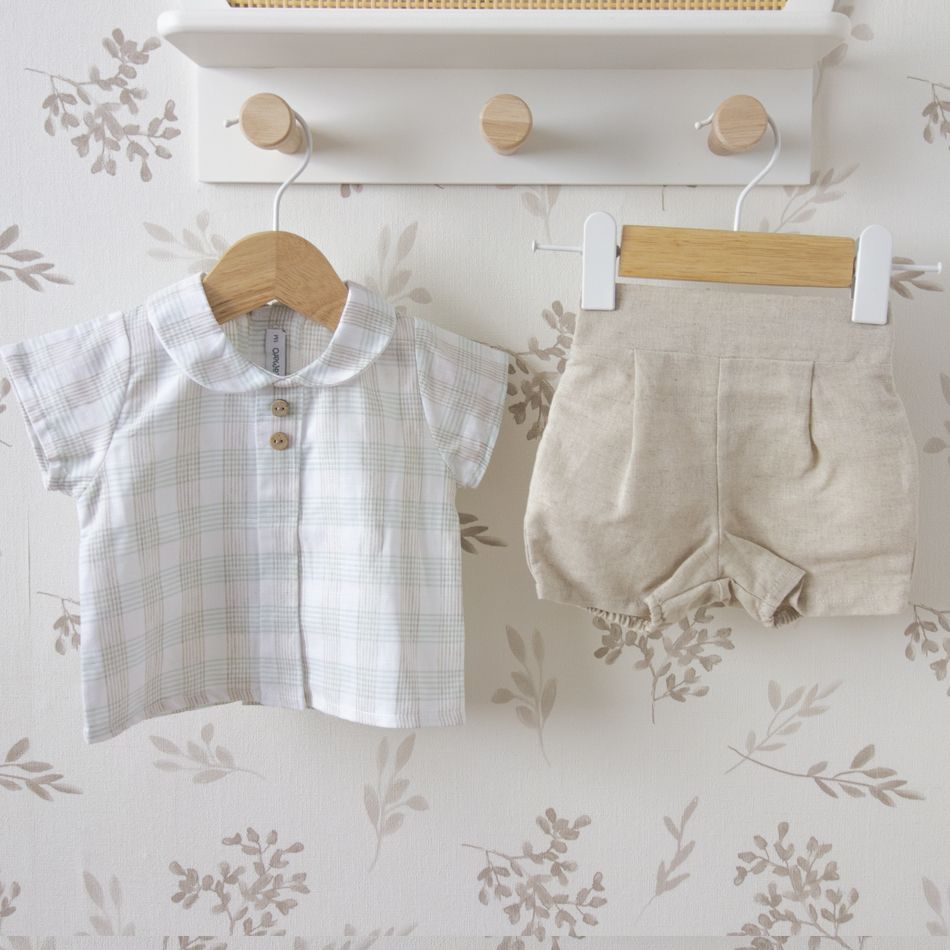 El diseño combina una delicada camisa de cuadros en tonos beige y blanco con un pantalón corto de textura natural que recuerda al lino. El resultado es un conjunto lleno de luz y armonía, ideal para los días de primavera y verano.