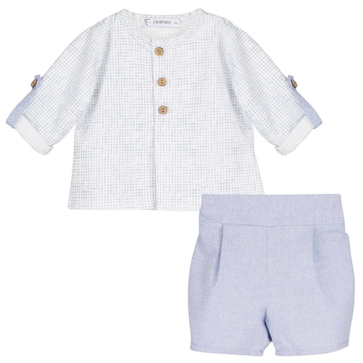 Las prendas infantiles más bonitas son aquellas que combinan sencillez, tejidos naturales y un diseño pensado para el confort del bebé. Este elegante conjunto bebé camisa plumeti y bermuda azul de la colección Shimla de Calamaro es un claro ejemplo de ese estilo clásico renovado que tanto nos gusta en Gateos Moda Infantil.