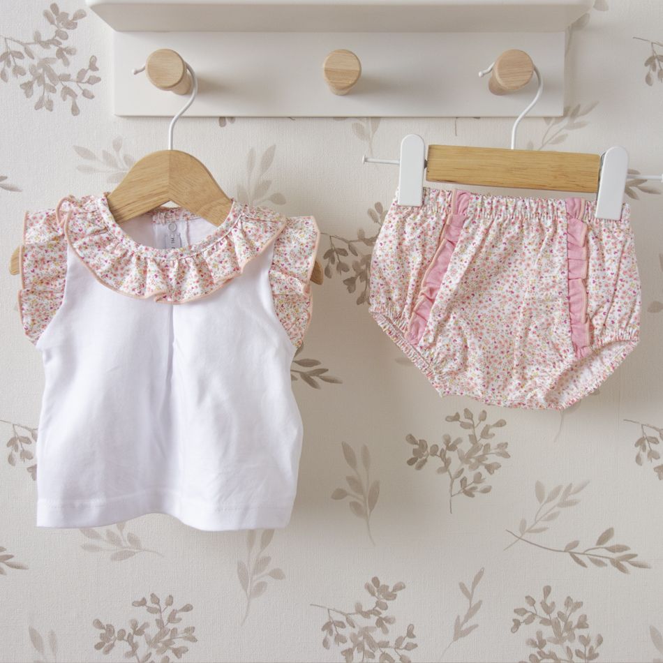 Este conjunto bebé flores rosa es ideal para acompañar al bebé en los momentos más bonitos del verano.