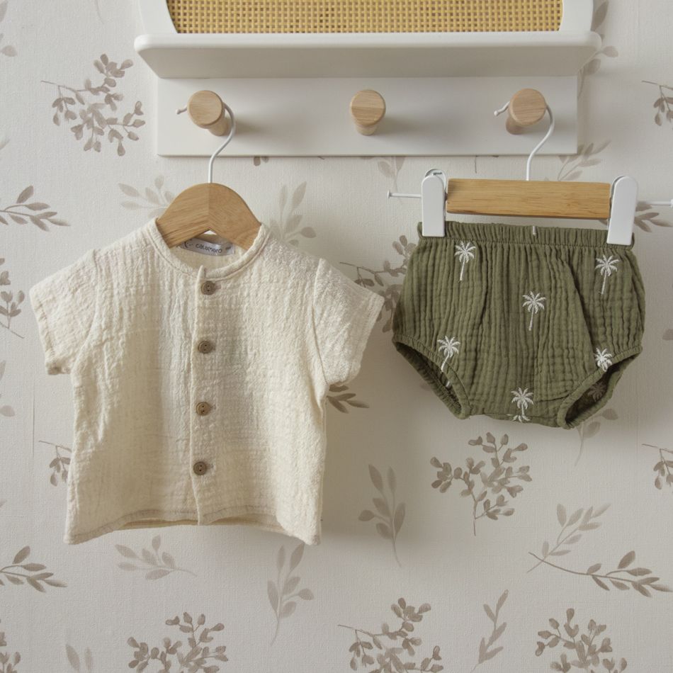 En Gateos nos gusta seleccionar prendas que respiran calidad en cada detalle. Este conjunto combina una camisa en tono lino natural con botones de madera y un pololo en color verde oliva decorado con pequeñas palmeras bordadas que evocan paisajes tropicales y tardes cálidas de verano.