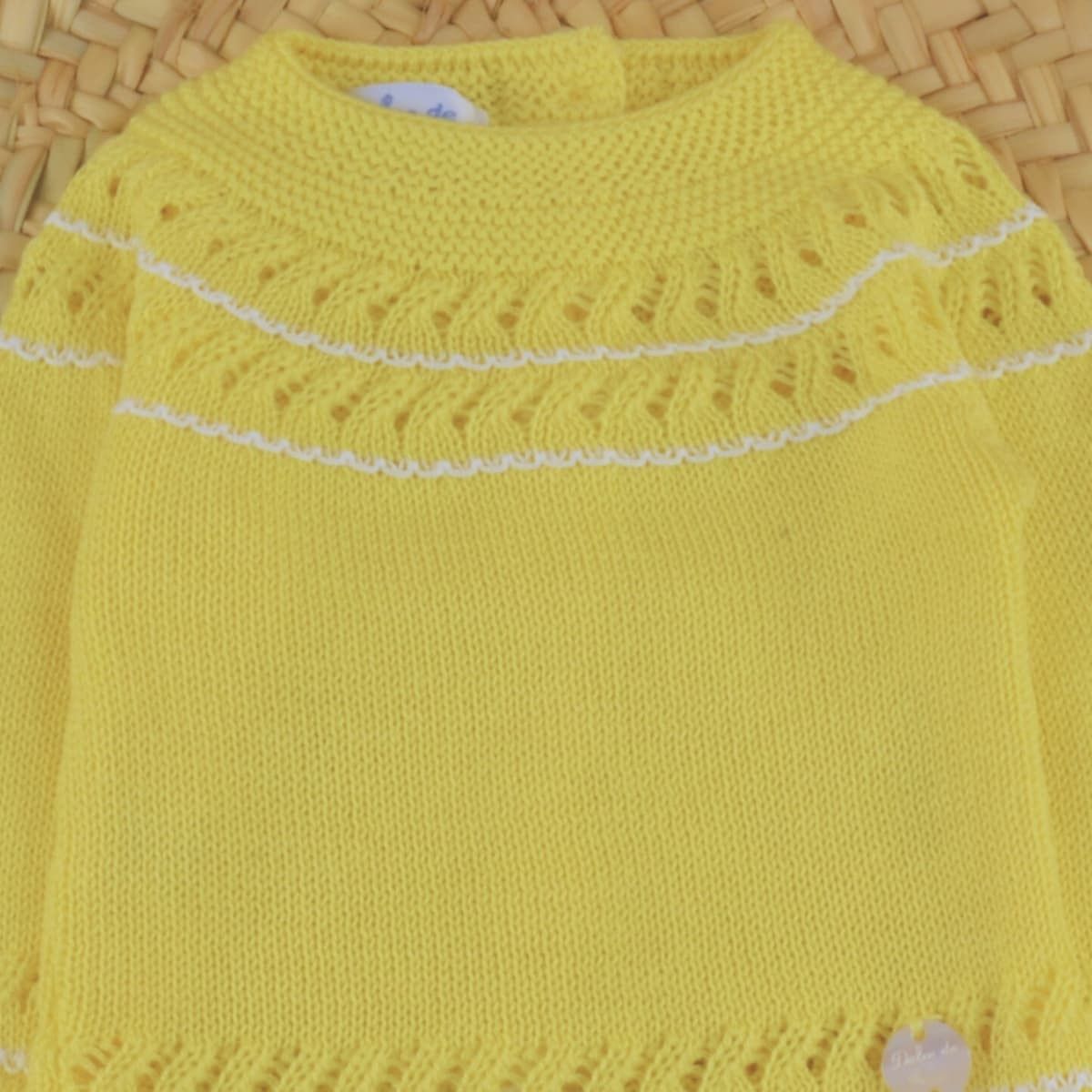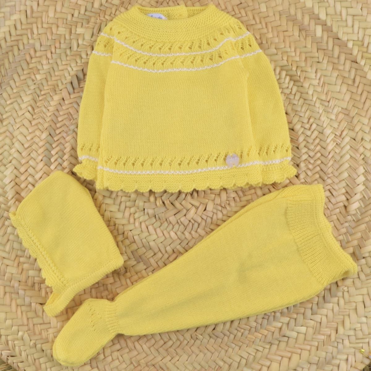 El conjunto bebé amarillo primera puesta punto de la colección Chimenea de Dulce de Fresa es una prenda diseñada para acompañar los primeros meses del bebé con suavidad, confort y un estilo clásico que nunca pasa de moda.