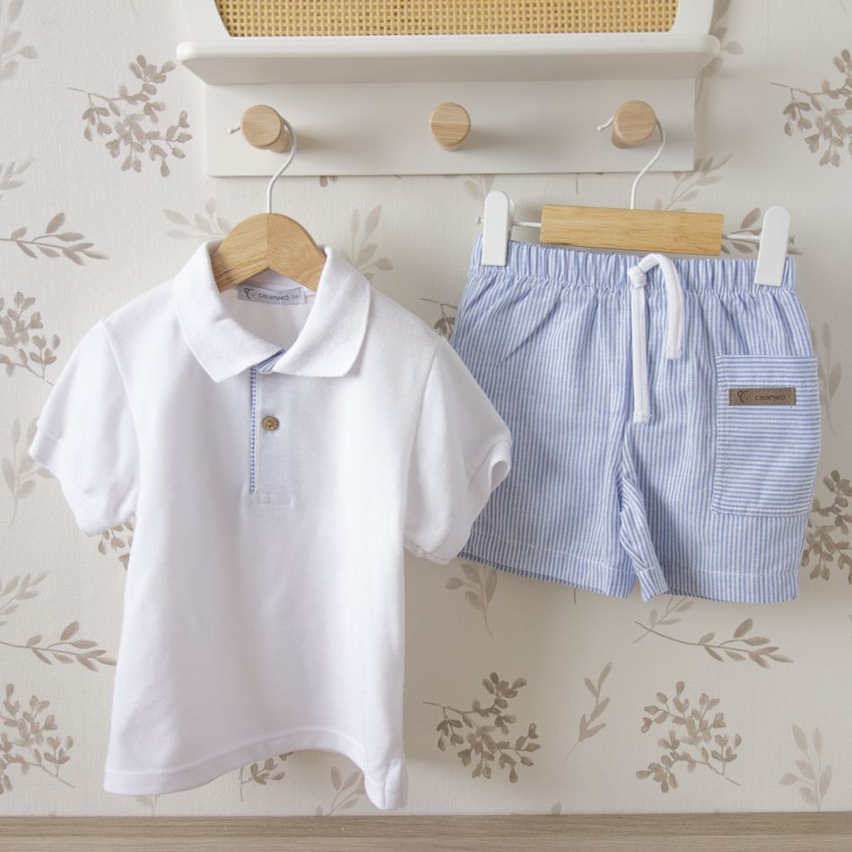 Este conjunto niño verano rayas está compuesto por una camiseta tipo polo en color blanco y un short de rayas azul cielo confeccionado en un tejido ligero y transpirable. Una combinación clásica que transmite frescura y estilo atemporal.