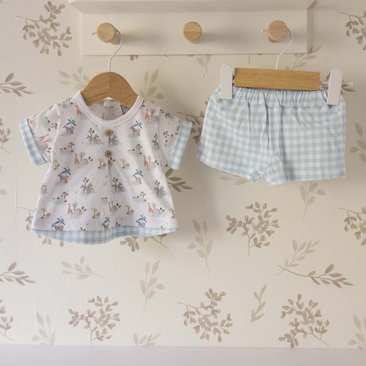 Conjunto bebé en tono verde agua confeccionado en 100% algodón, compuesto por camiseta estampada y pantalón corto vichy. Ligero, fresco y cómodo, es perfecto para los días de verano. Su diseño delicado combina funcionalidad y estilo, ideal para vestir al bebé con elegancia y suavidad en cualquier ocasión.