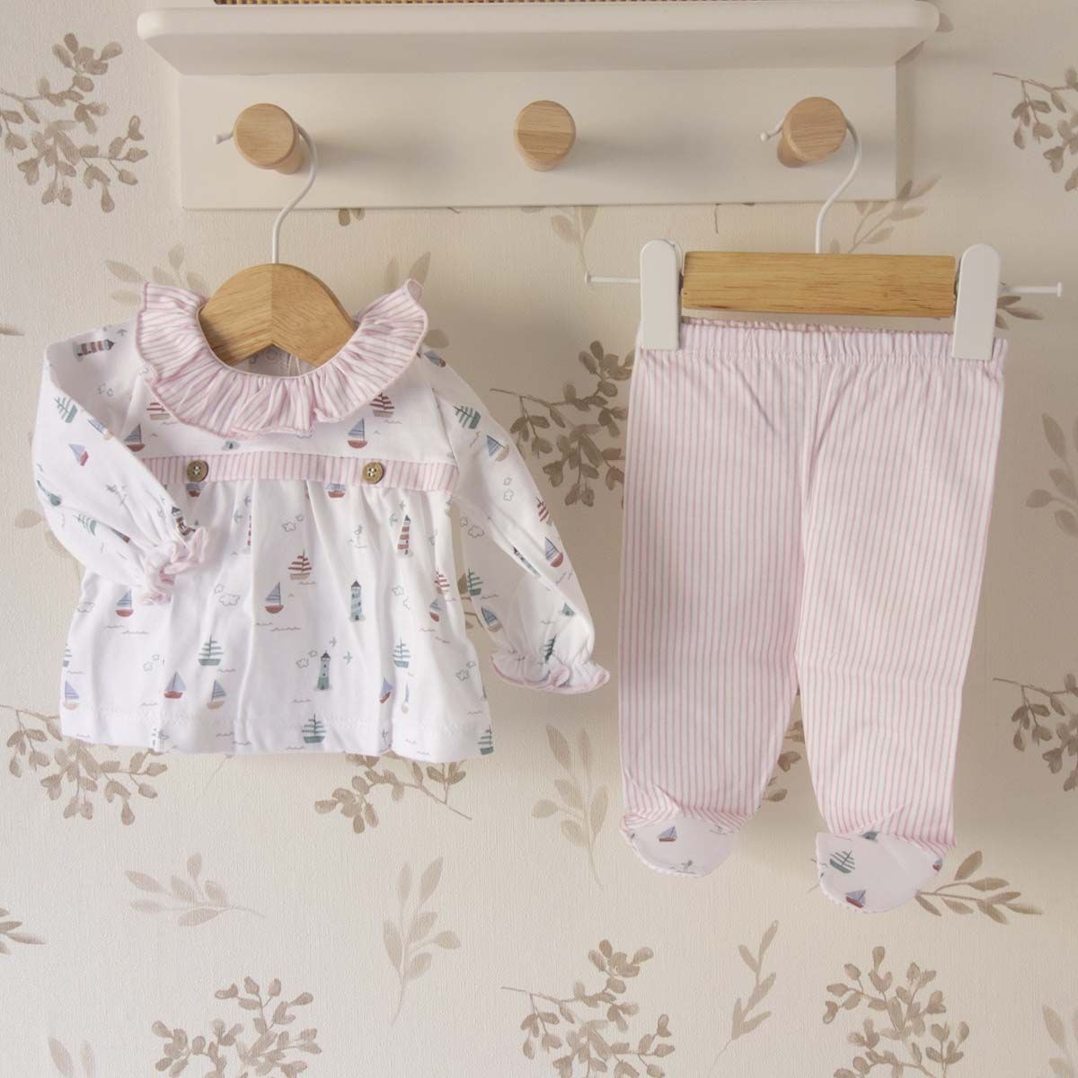 El tejido de algodón utilizado en este conjunto ofrece una textura agradable, ligera y transpirable. La parte superior presenta un acabado con estampado de inspiración marinera con pequeños barcos en tonos suaves, mientras que la polaina en rosa empolvado incorpora un tejido de punto fino que se adapta sin oprimir. Esto permite libertad de movimiento y bienestar durante todo el día.