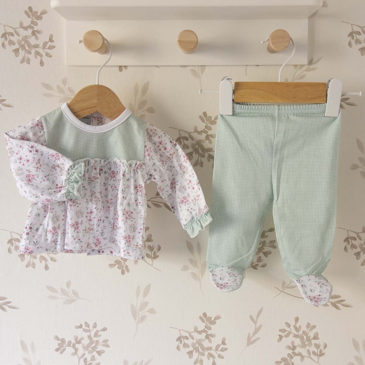 Este conjunto está confeccionado en algodón 100%, un tejido natural especialmente indicado para la piel sensible del bebé. La blusa presenta un estampado floral delicado con acabado ligero, mientras la polaina en verde liso aporta equilibrio visual. Su textura transpirable ayuda a mantener una temperatura adecuada, evitando incomodidades.