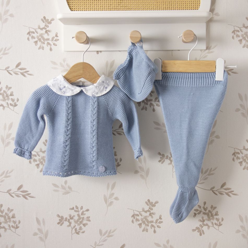 Además, su precioso tono azul cielo aporta luminosidad y delicadeza al conjunto, creando una prenda perfecta para los primeros meses del bebé.