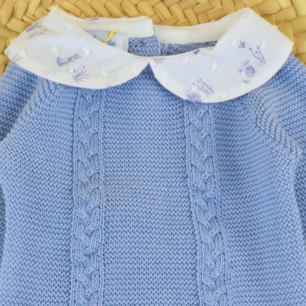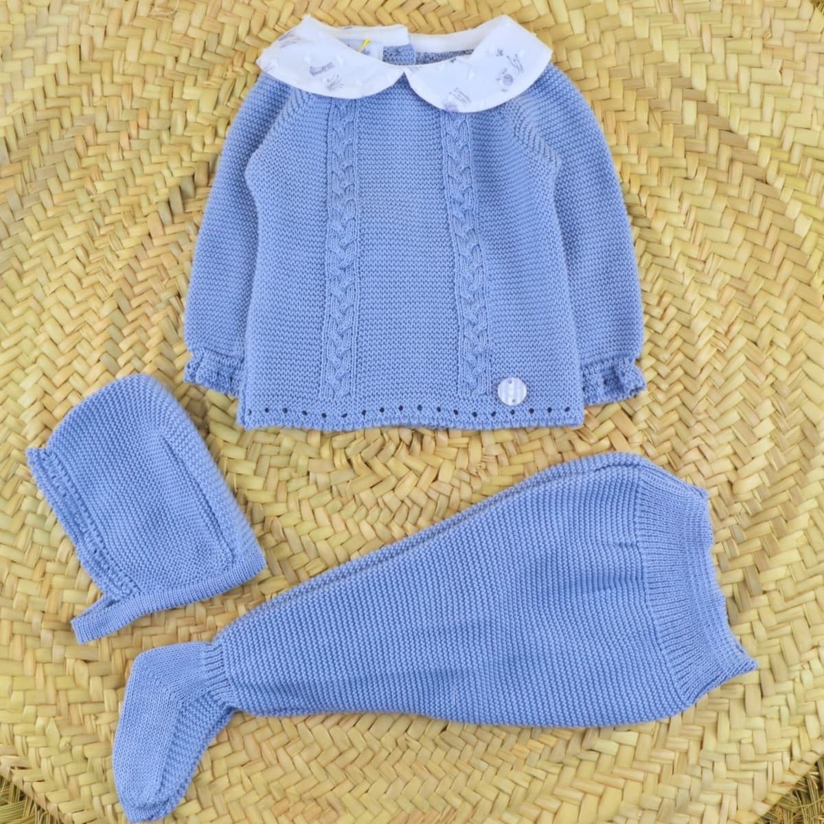 El conjunto bebé punto azul conejitos de Dulce de Fresa combina tradición, comodidad y una estética infantil clásica perfecta para los primeros meses del bebé.