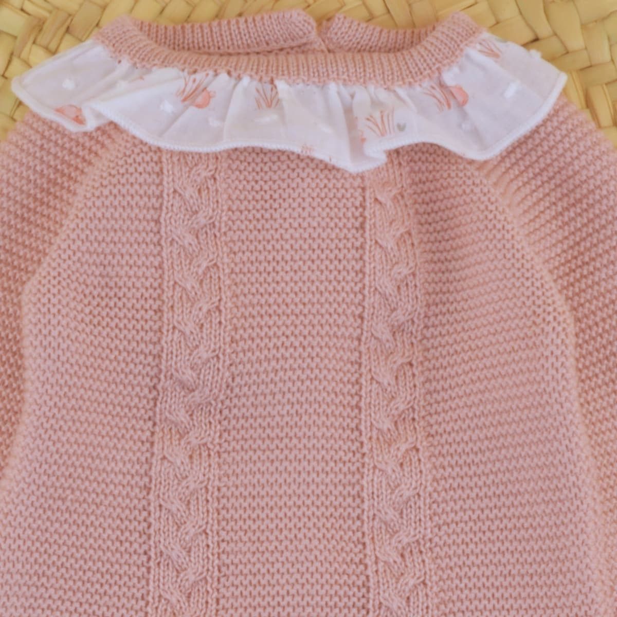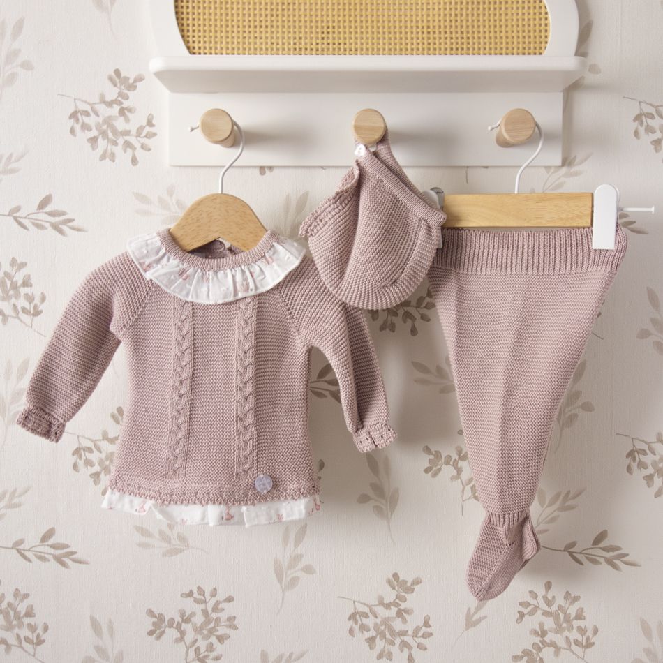 Además, su delicado tono rosa empolvado aporta dulzura y elegancia al conjunto, creando una prenda especialmente bonita para las primeras etapas del bebé.