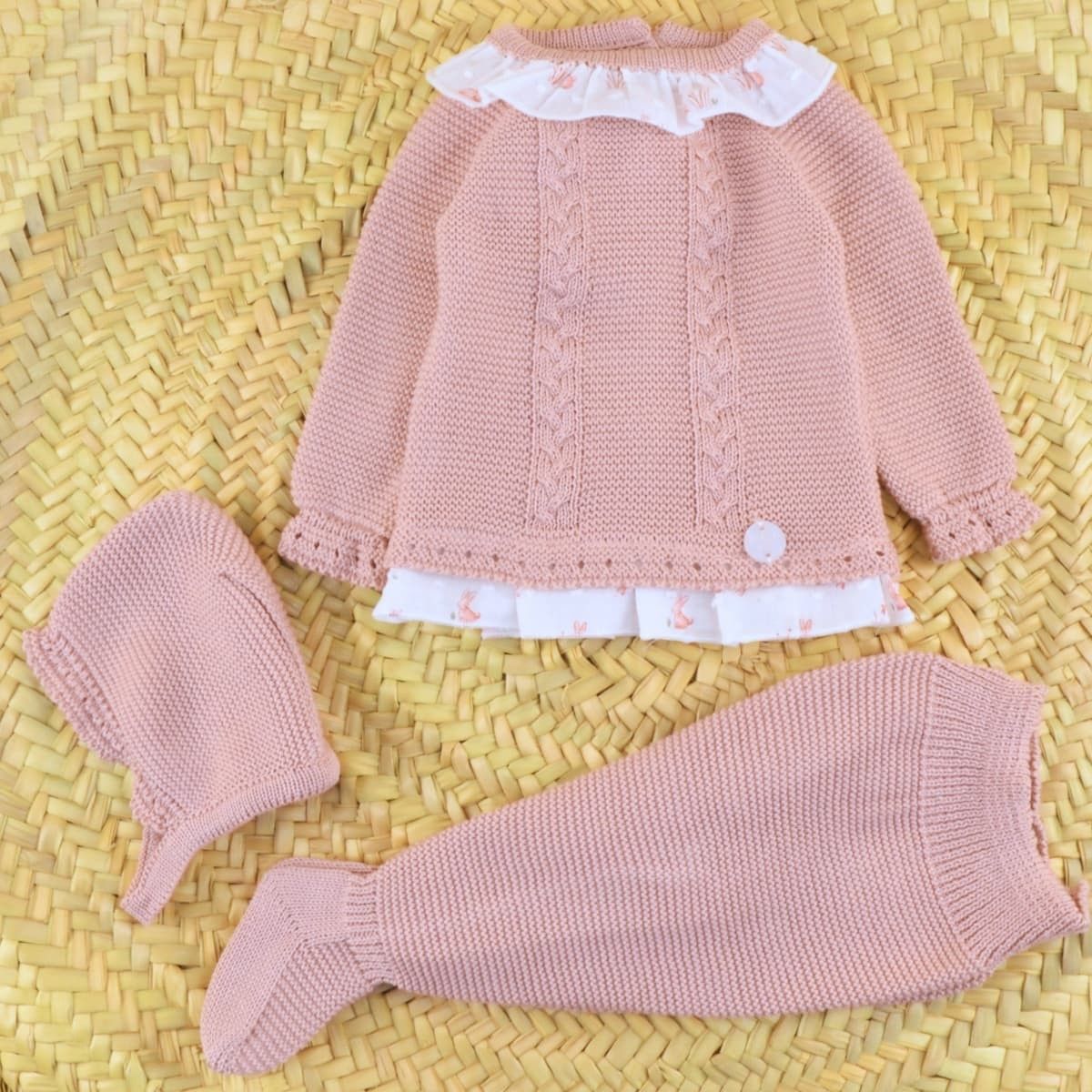 El conjunto bebé punto rosa conejitos de Dulce de Fresa es una prenda pensada para vestir al bebé con suavidad, elegancia y ese encanto clásico tan característico de la moda infantil española.
