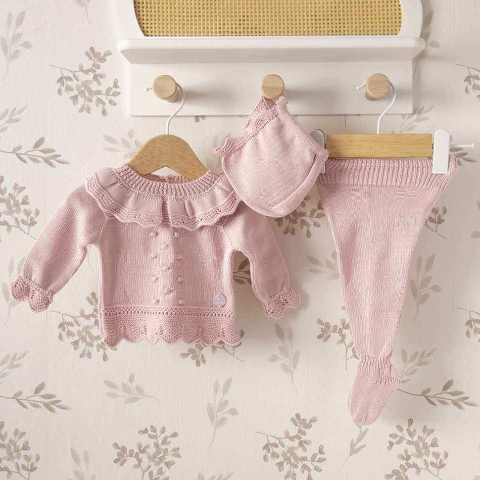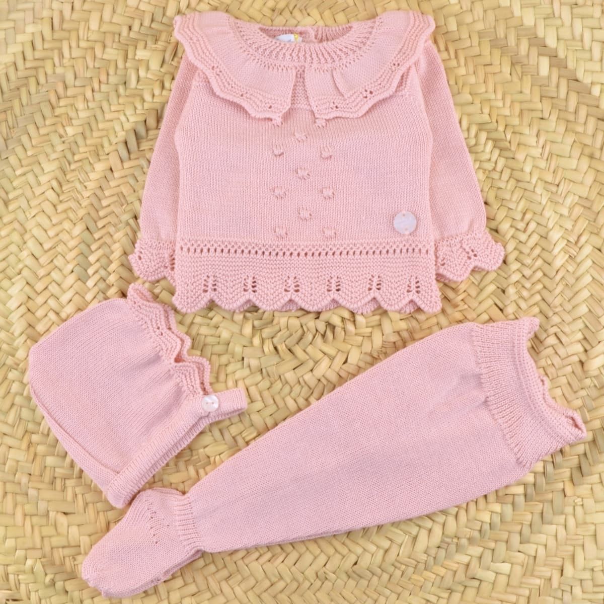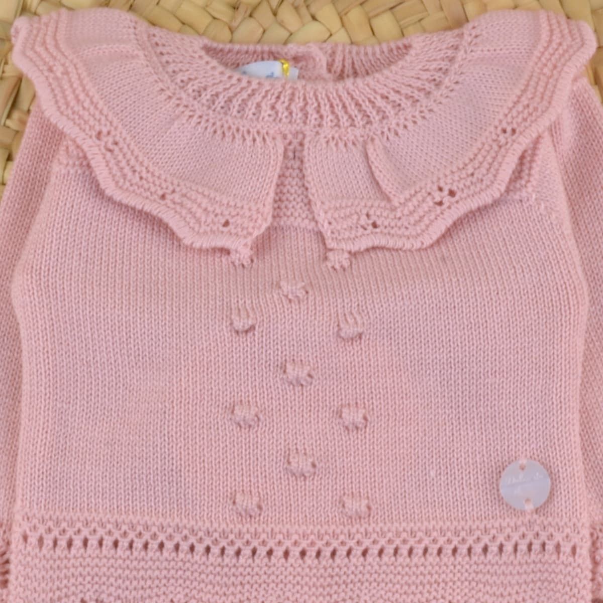 La prenda principal es una chaqueta de punto en rosa empolvado, un tono delicado que transmite ternura y calidez. Su diseño incorpora un cuello calado con ondas suaves, un detalle tradicional que aporta volumen visual y enmarca el rostro del bebé con un aire dulce y refinado.