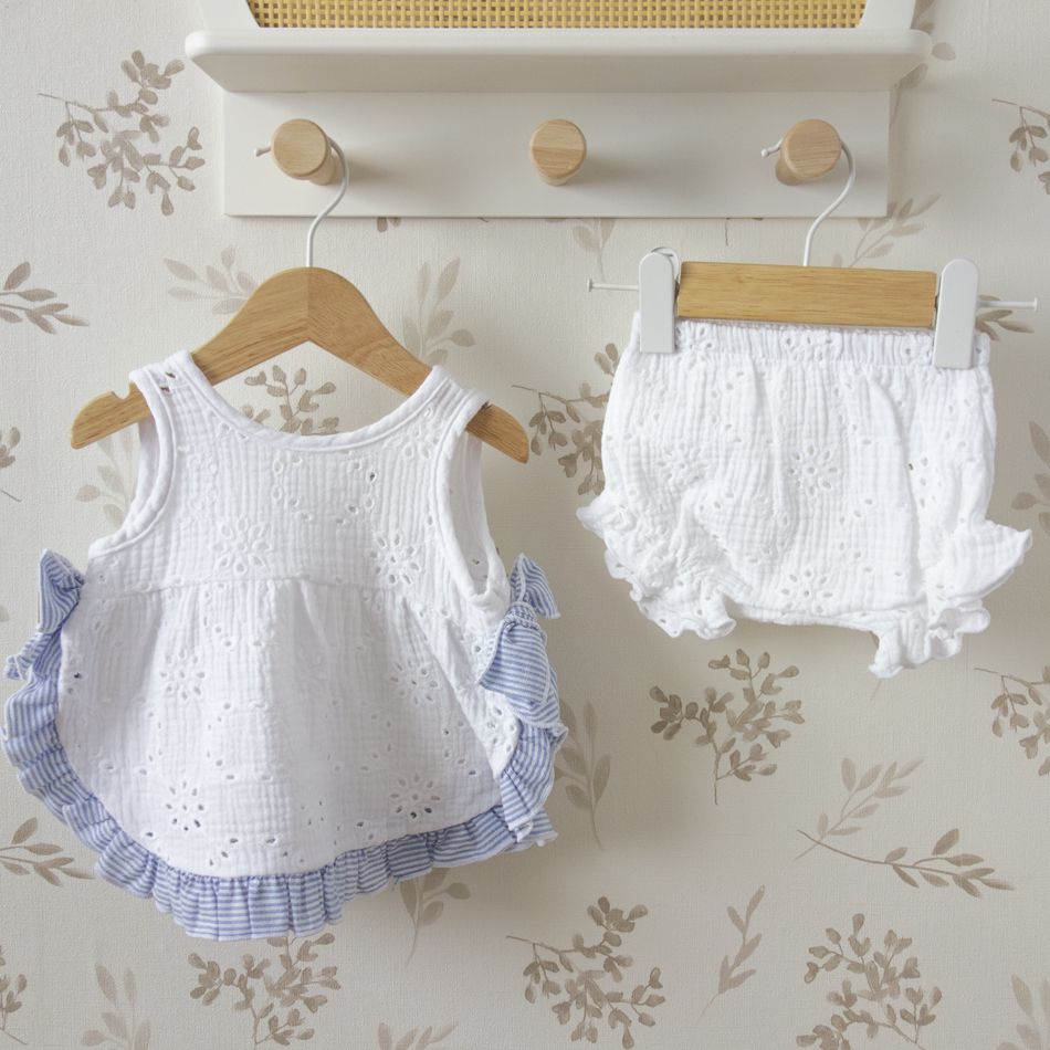 Las prendas infantiles con bordados delicados transmiten una sensación especial de ternura y tradición. Este diseño de la colección Kerala de Calamaro combina la frescura del verano con detalles cuidadosamente pensados para crear un conjunto lleno de encanto.