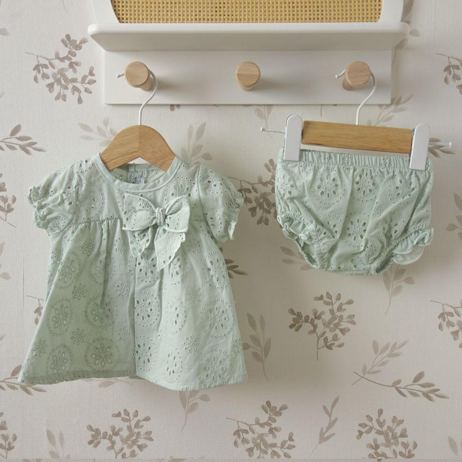 La combinación del bordado inglés con el tono verde agua crea una estética elegante que recuerda a los vestidos infantiles más tradicionales.