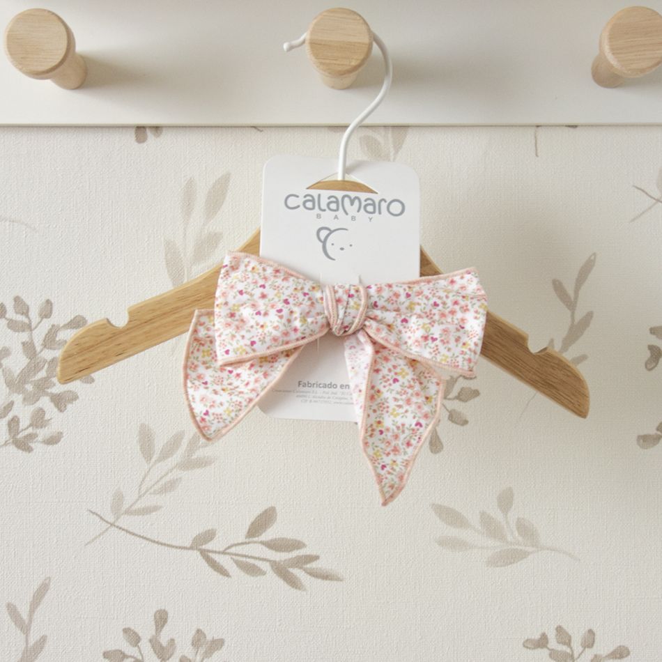 Confeccionado en algodón 100%, el lazo presenta un delicado estampado floral mini liberty en tonos rosa empolvado, melocotón suave y pequeños matices verdes.