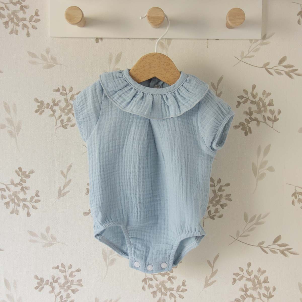 Confeccionada en algodón suave con textura ligera 🌿, incorpora un precioso cuello volante fruncido que aporta un aire romántico y elegante . Su diseño cómodo permite libertad de movimiento, mientras que el cierre inferior facilita el cambio de pañal 🧷