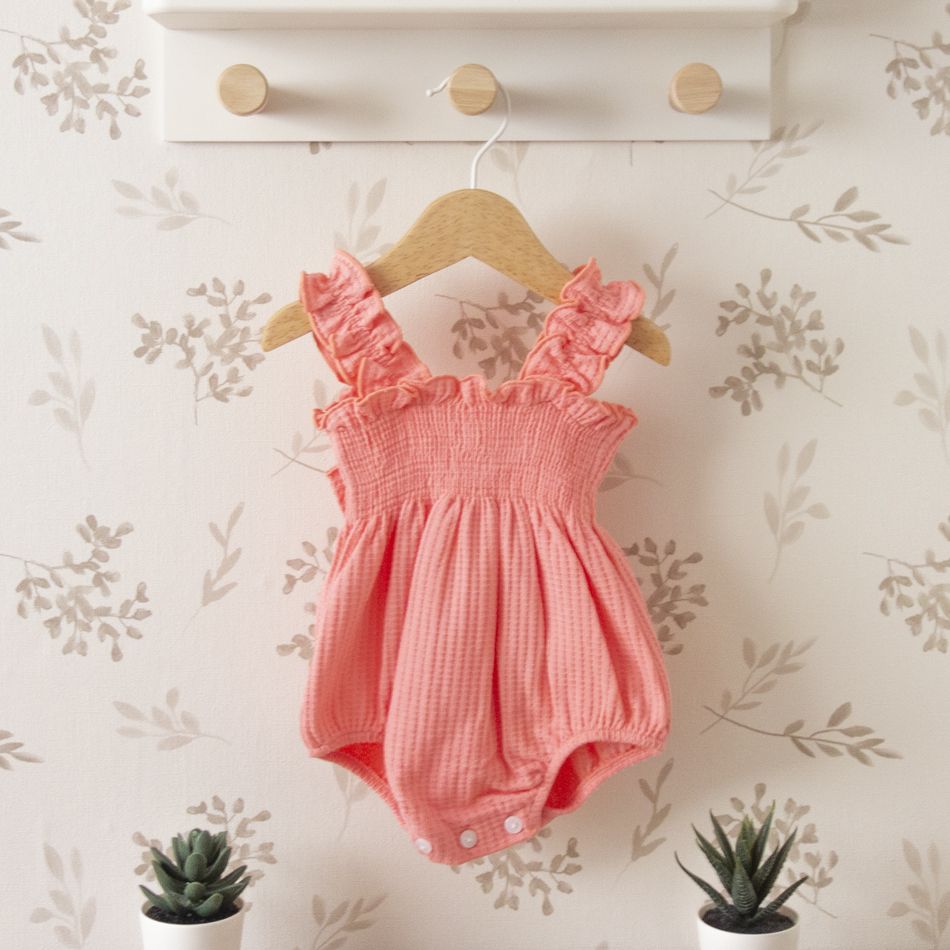 El pelele bebé coral tirantes volante es ideal para vestir al bebé durante los meses más cálidos.