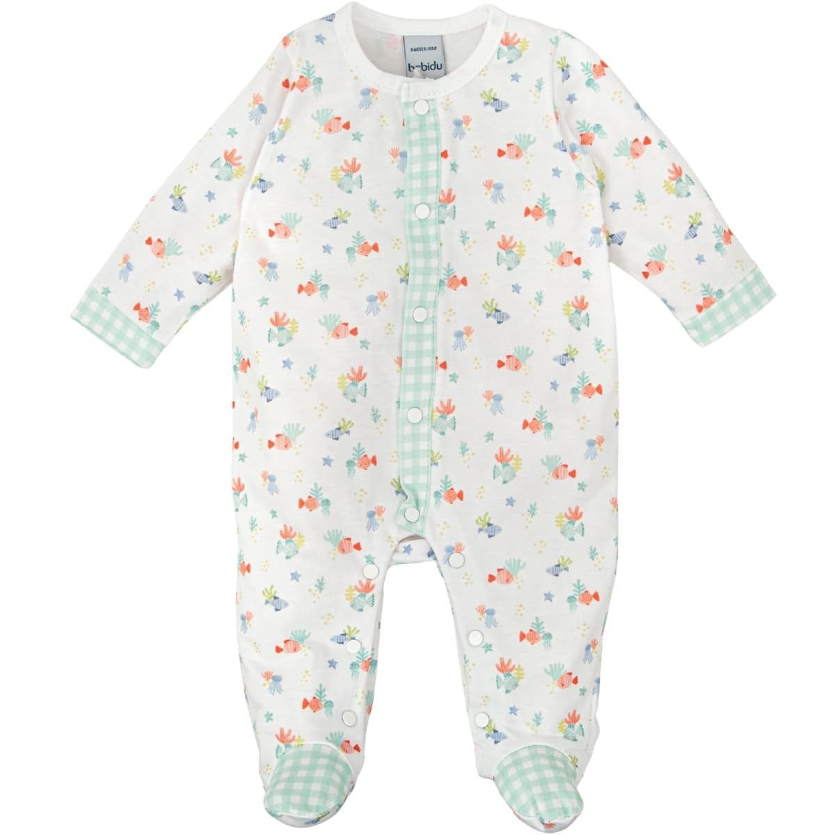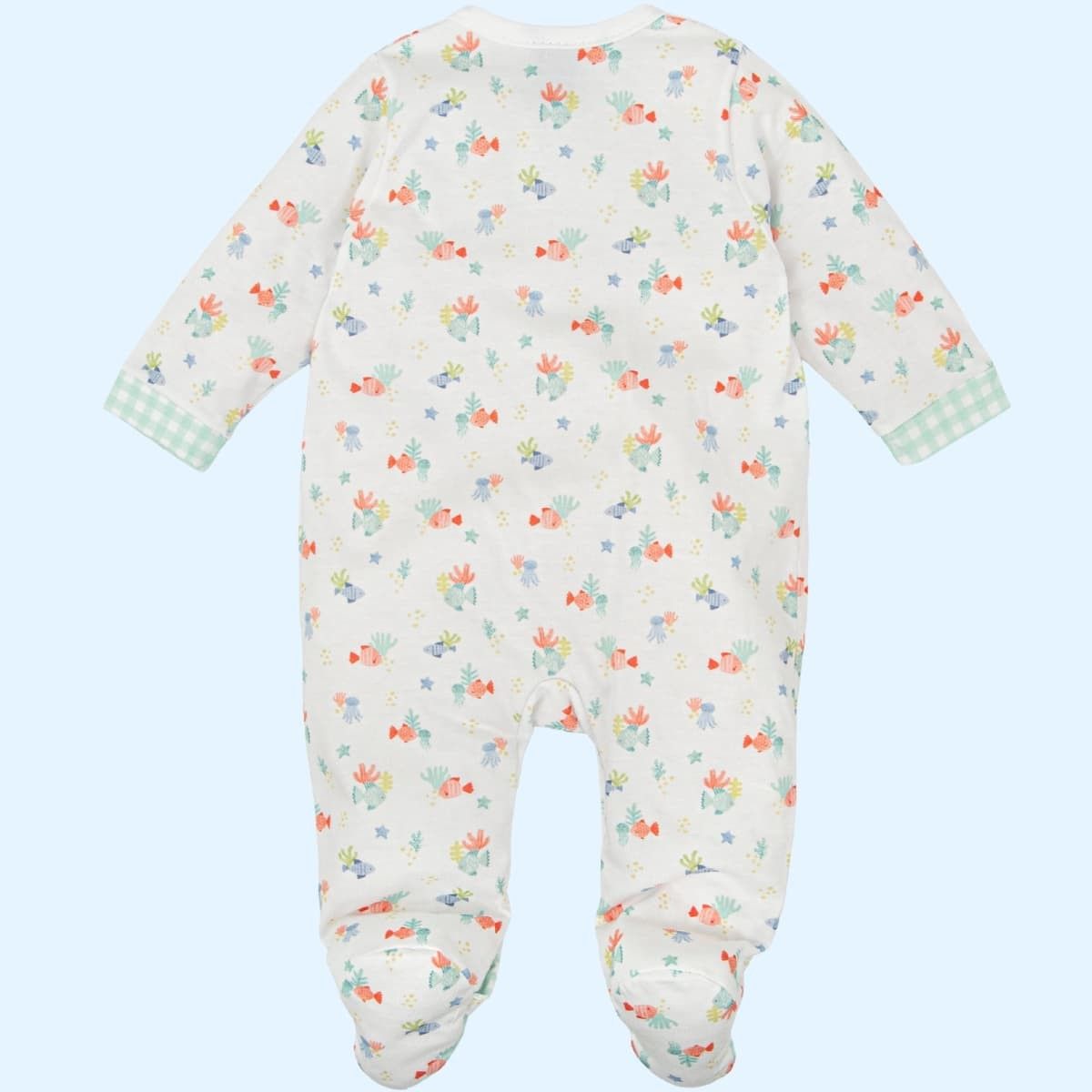 Confeccionado en algodón de alta calidad, este pelele ofrece una textura suave, ligera y transpirable. El estampado floral aporta delicadeza visual, mientras que los detalles en vichy verde añaden un toque clásico. Su diseño enterizo se adapta cómodamente al cuerpo del bebé sin generar presión, favoreciendo su bienestar.