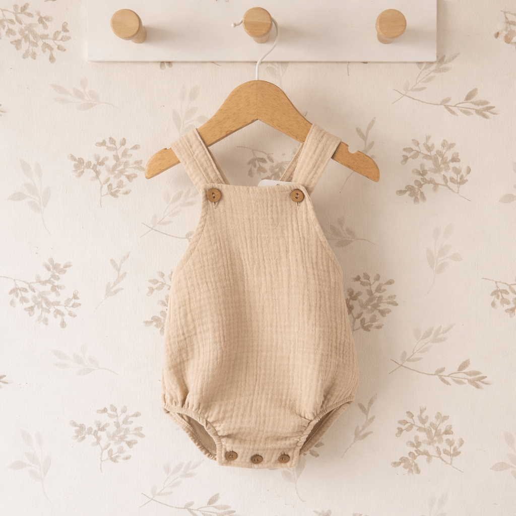 Confeccionada en tejido tipo gasa ligera y transpirable, es ideal para mantener a tu bebé cómodo durante todo el día 🌬️. Los tirantes con botones efecto madera 🌿 aportan un toque rústico y delicado, mientras que el cierre inferior con botones facilita el cambio de pañal 👶✨